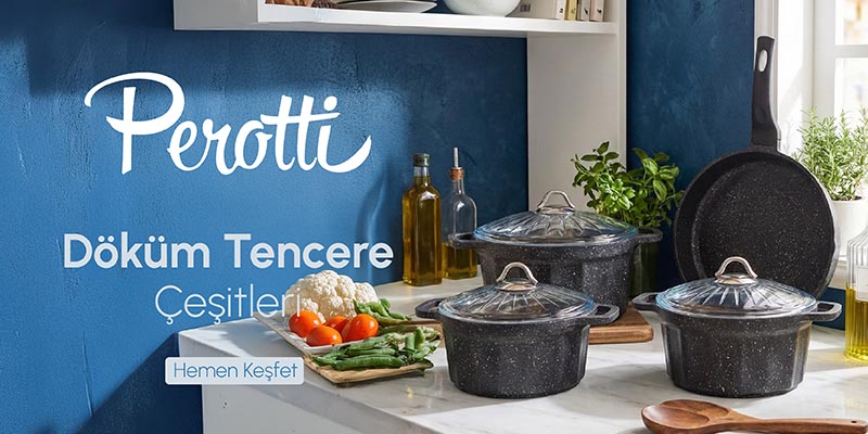 Yüzde yüz yerli sermaye ile kurulan ve züccaciyeden banyo ürünlerine kadar hem dekoratif hem de işlevsel seçenekler sunan Perotti, tüm dünyada trend olan ev dekorasyon, banyo, mutfak ve sofra ürünlerini Türkiye’deki kullanıcılar ile buluşturur. İşlevsel ve şık çok özel tasarımlara da imza atan başarılı marka mutfak, sofra ve banyo gereçlerini hem fonksiyonel hem de dekoratif bir obje şıklığında tasarlar. Alanında uzman tasarımcıların imzasını taşıyan ürünleri yeni nesil üretim tesislerinde, yüksek kaliteli malzemeler ve son teknoloji üretim aşamaları ile hayata geçiren Perotti, özellikle cam ve saf porselen ürünleri ile öne çıkar. Kullanıcı ve eleştirmenlerden tam not alan başarılı marka, pişirici grubu ürünlerden sofra gereçlerine kadar zengin bir ürün yelpazesi ile hizmet verir. Her kullanıcının sahip olmak isteyeceği tasarım harikası mutfak gereçleri ile benzerlerinden ayrılan sektör devi, cam, porselen ve bambunun bir araya gelmesi ile oluşan zarif mutfak gereçleri ile övgü toplar. Mutfak ve banyolarda pratik bir kullanım vadeden ürünlerin yanı sıra çok özel fincan, yemek, pasta ve bardak setleri ile de beğeni toplar. Her geçen gün yeni ürünler geliştirerek ürün gamını genişleten Perotti markası, kupa setlerinden erzak kavanozlarına, sıvı sabunluklardan cidarlı kaselere kadar her biri çok özel tasarımlara sahip ürünleri ile sektöre öncülük eder. Şık ve zarif ürünlere ve dekoratif yönü de en az işlevi kadar gelişmiş olan gereçlere sahip olmak, basit dokunuşlarla mutfak ve sofralarında bambaşka bir atmosfer oluşturmak isteyen kullanıcılara zengin alternatifler sunar. El rondosundan yağ sıçratmayan tencere kapağına kadar pratik kullanımı ile öne çıkan gereçler de üreten başarılı marka, her bir ürünü ile kullanıcıların hayatını hem kolaylaştırmayı hem de güzelleştirmeyi hedefler. Kar küresi gibi ev dekorasyon ürünleri ile de yoğun ilgi gören marka, en son trend ev dekorasyon ürünlerini takip eden kullanıcılara da hitap eder. Nadir bulunan tasarımları ile yoğun ilgi gören Perotti markası, geliştirdiği ve tedarik ettiği tüm ürünleri ulaşılabilir fiyat seçenekleri ile sunarken aynı zamanda uzun ömürlü kullanım vadeder.