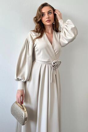 Aspendia Kadın Vatkalı Çıkarılabilir Fiyonk Detaylı Balon Kollu Midi Elbise