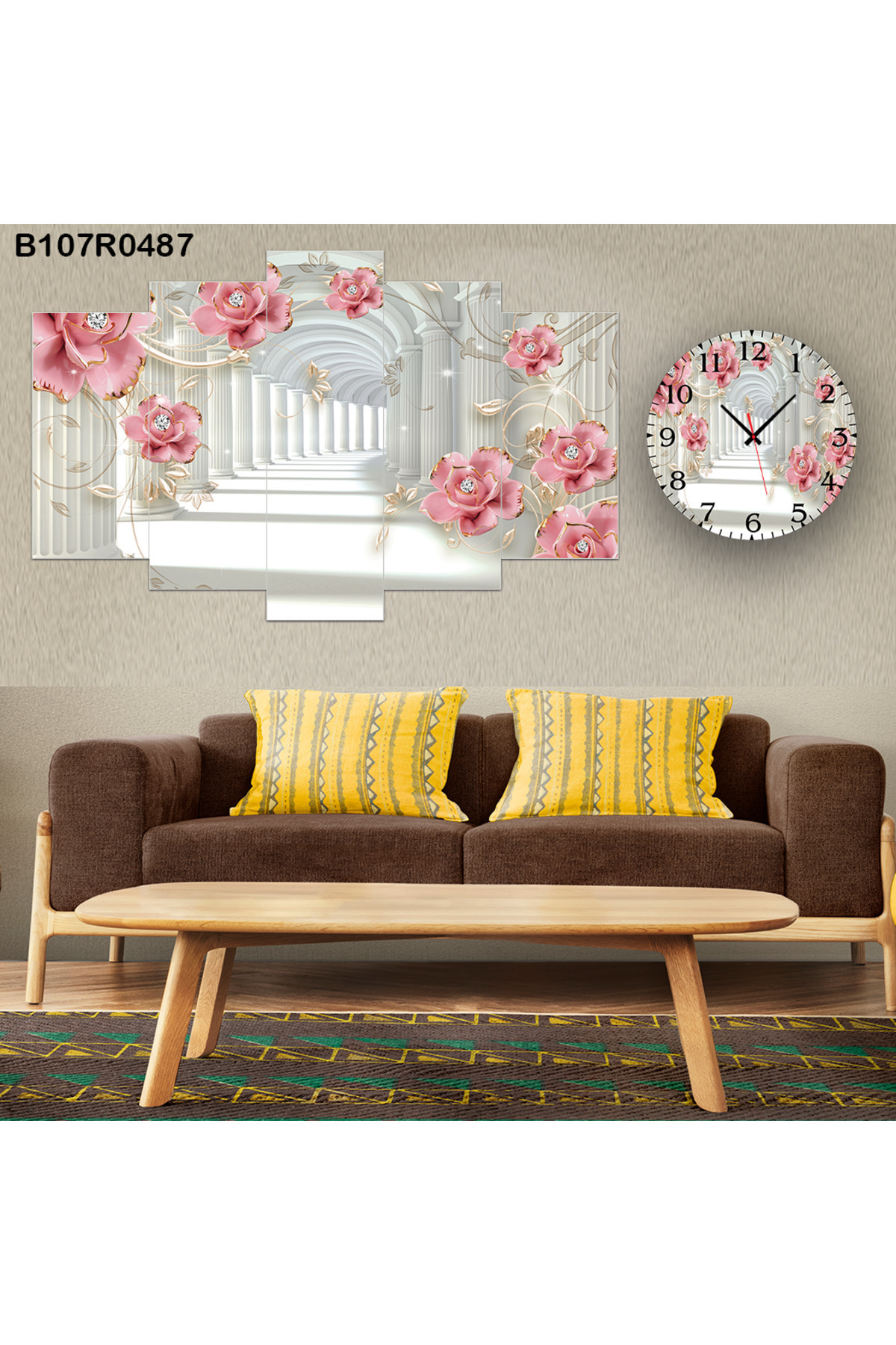 A2ZTR Parçalı Ahşap Duvar Tablo 5 Parça Set Ve saatli