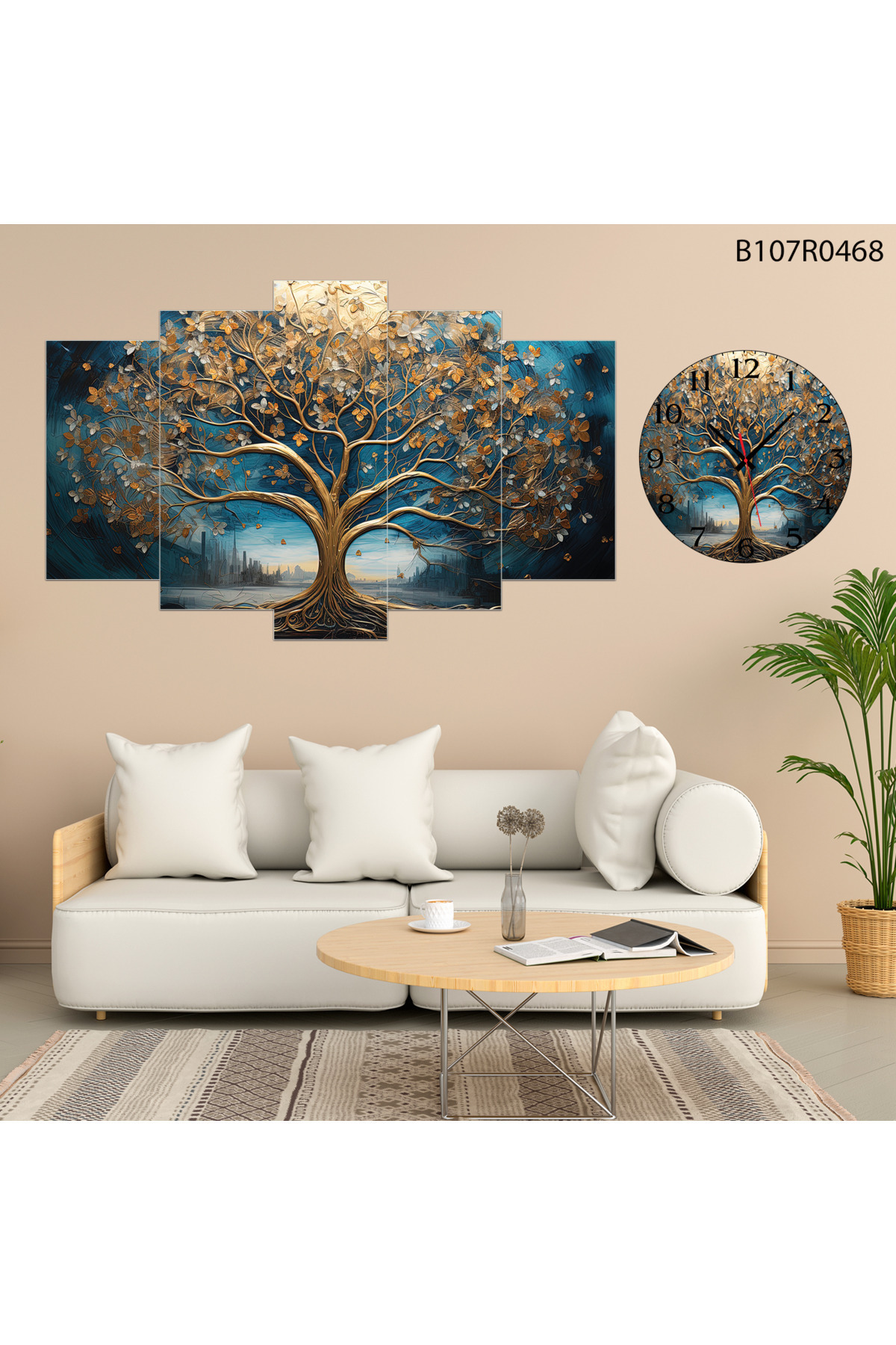 A2ZTR Parçalı Ahşap Duvar Tablo 5 Parça Set Ve saatli