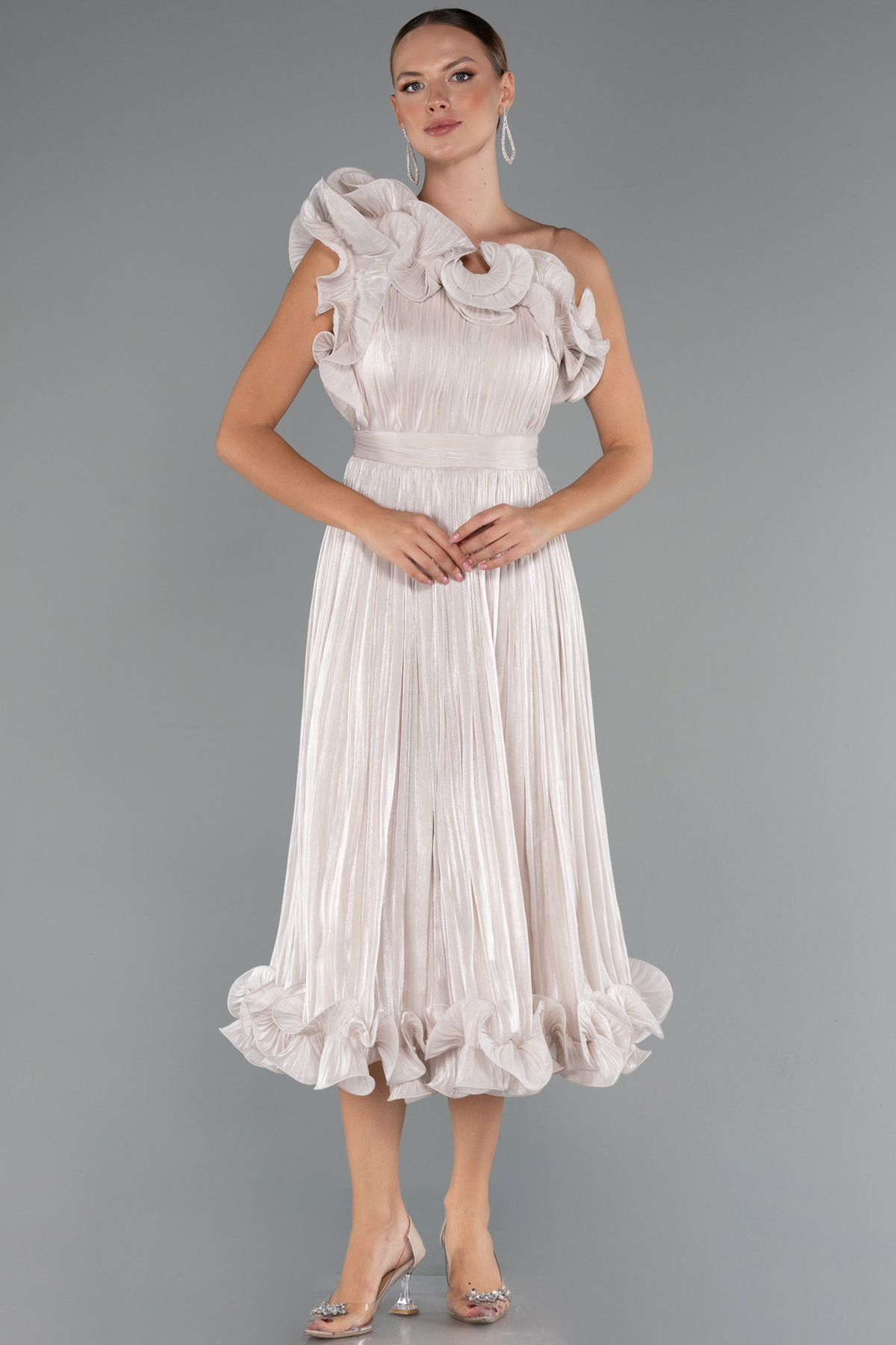 Abiyefon Bej Fırfırlı Tek Omuz Midi Şifon Abiye Elbise ABK2434 Özellikleri