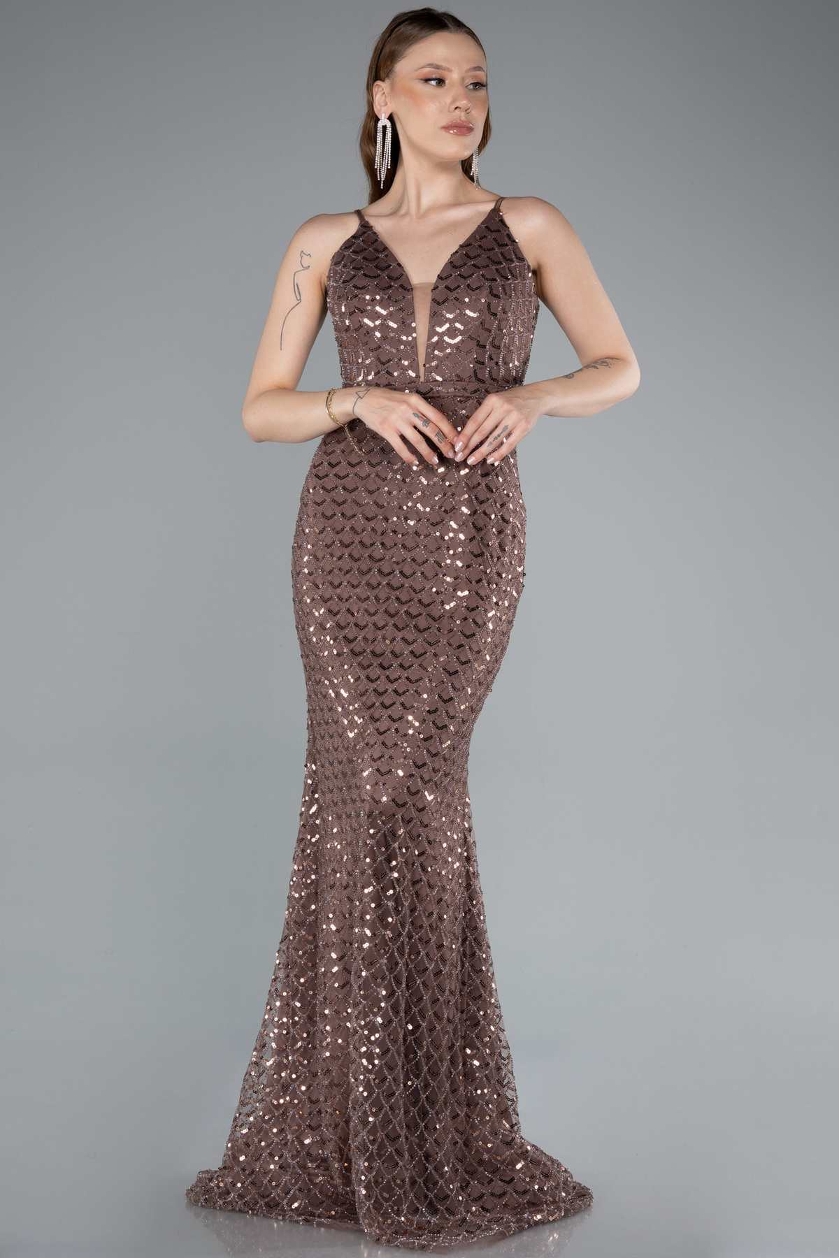 Abiyefon Kahve Askılı Uzun Pul Payet Balık Abiye Elbise ABU4980 Özellikleri
