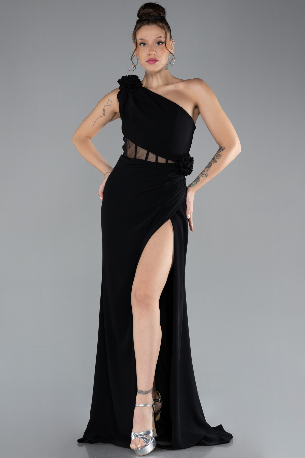Abiyefon Siyah Tek Omuz Bacak Dekolteli Uzun Abiye ABU4381 Özellikleri