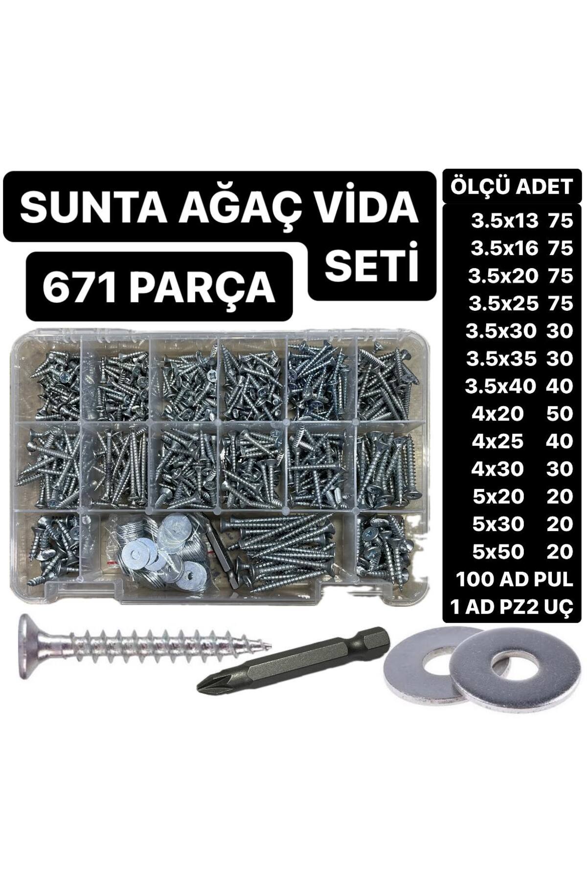 ACAR CİVATA 671 Adet Sunta Ağaç Vidası Pul Ve Uç Seti