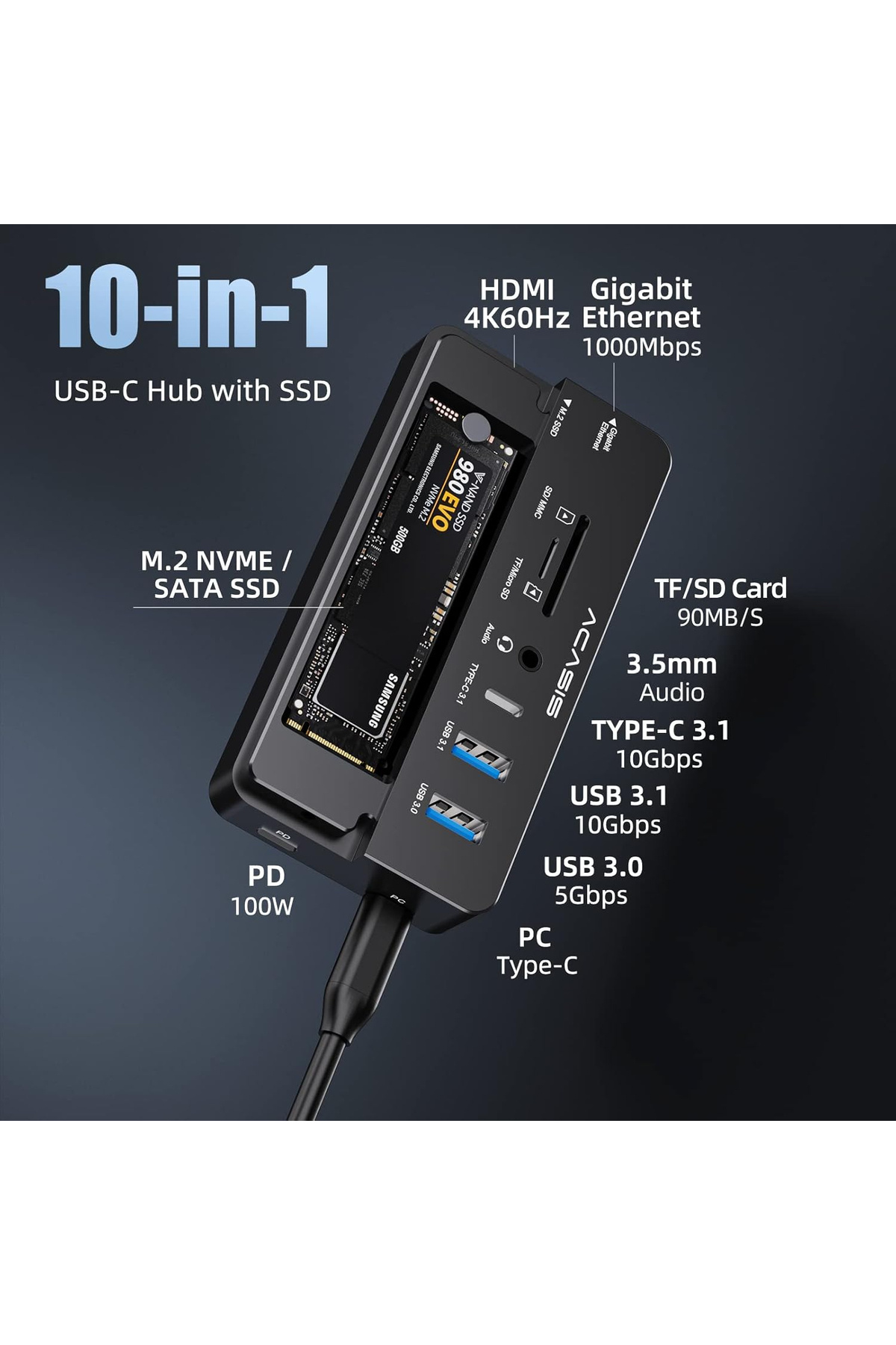 Acasis 10 Gbps, 10 in 1, M.2 NVMe SSD, 100W PD, HDMI 4K@60Hz, Gigabit Ethernet, 1x10Gbps Type-C,