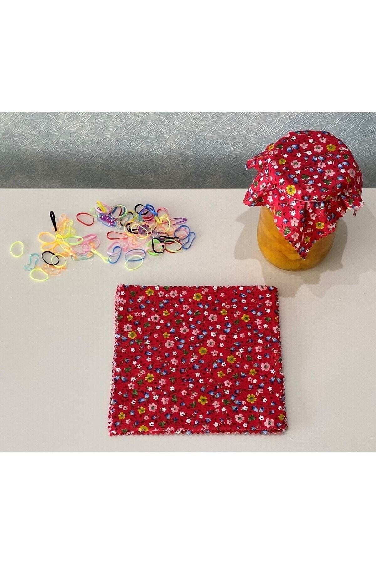AdaEsintisi 50 Adet PÇiçekli Kırmızı Kavanoz Kapağı Kumaşı (Örtüsü) ve Renkli Bağlama Lastiği