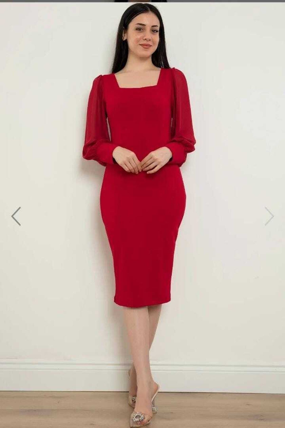 ADALYA BUTİK Kırmızı Kare Yaka Midi Boy Elbise Özellikleri