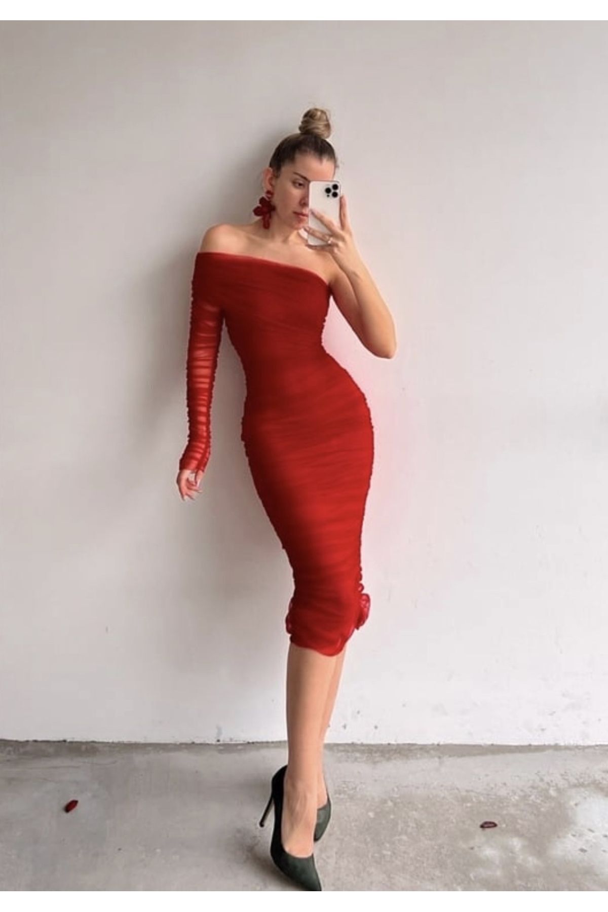 Afiş Butik Kırmızı Tek Omuz Tül Drapeli Elbise Özellikleri