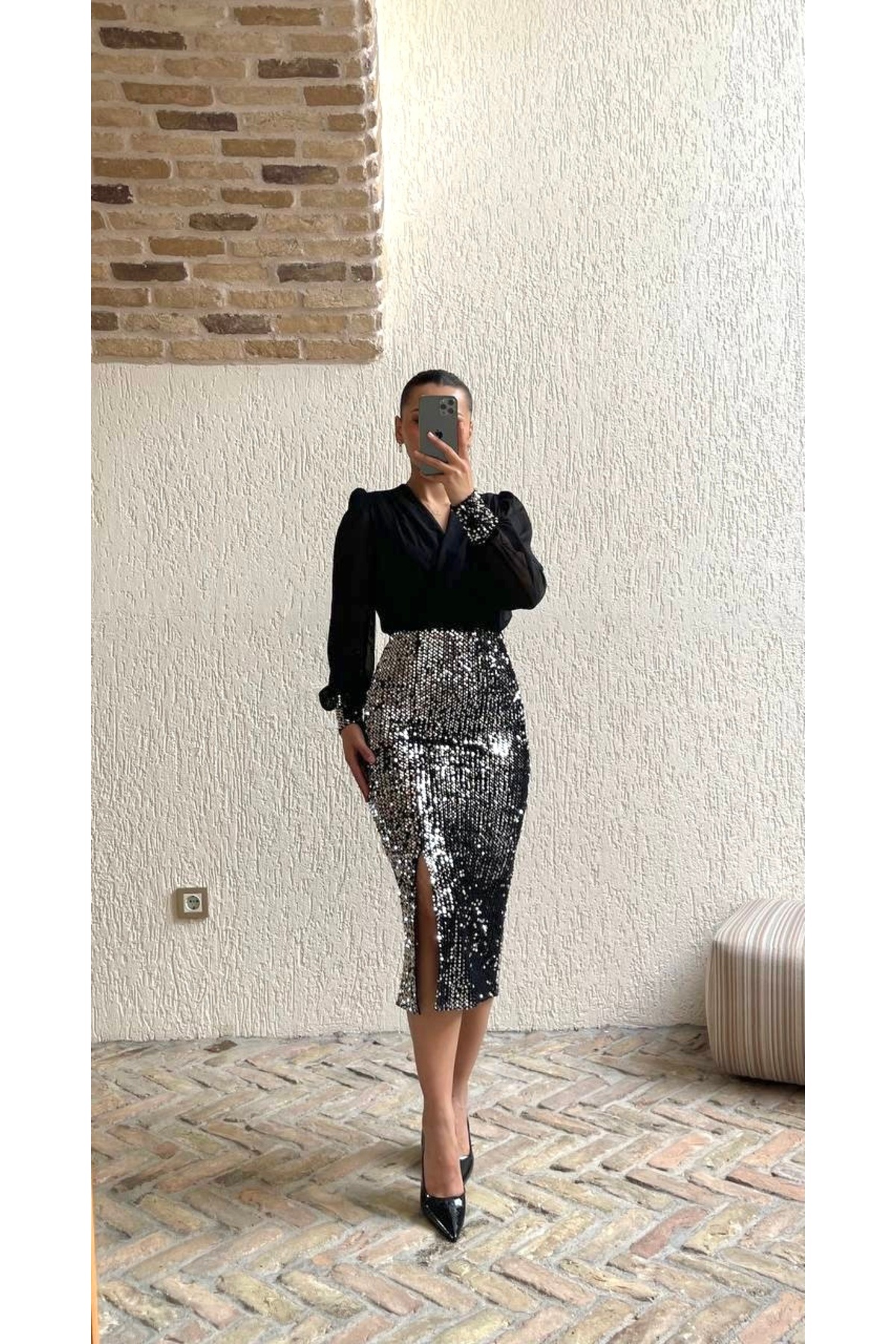 Afiş Butik Siyah Kruvaze Yaka Şifon Üst Pul Payetli Yırtmaçlı Elbise Midi Elbise Özellikleri