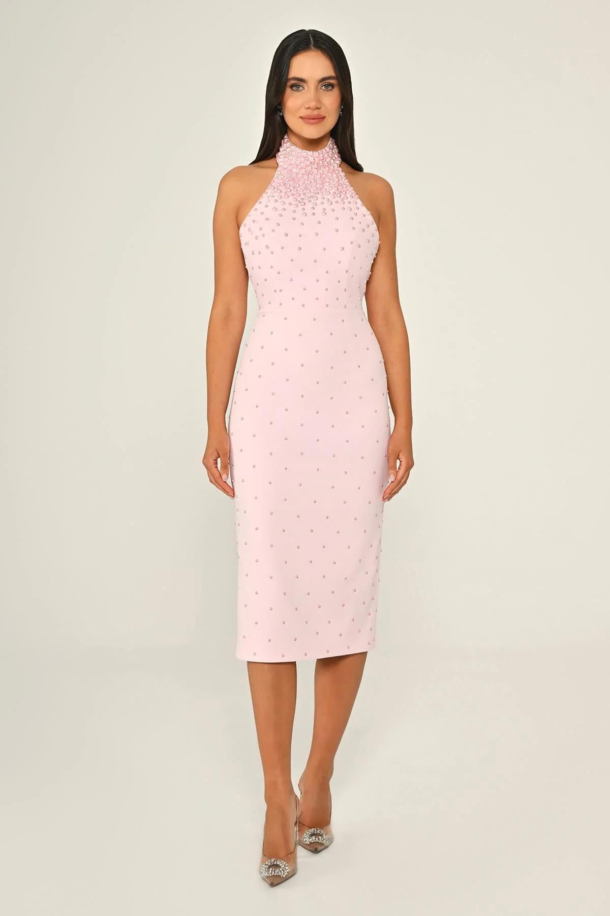 ALFABETA Halter Yaka Inci Işlemeli Krep Midi Elbise