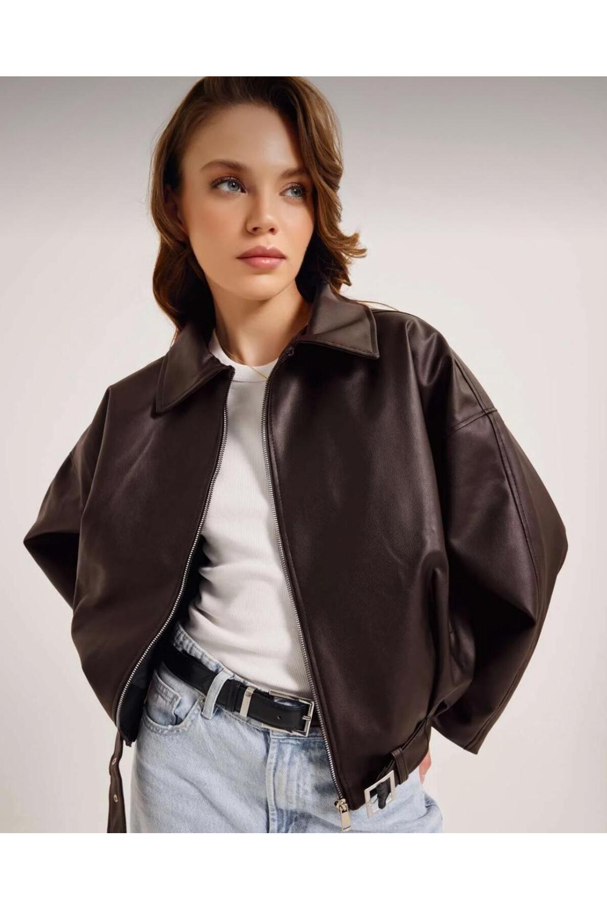 ALINTERYY Kadın Oversize Deri Bomber Ceket