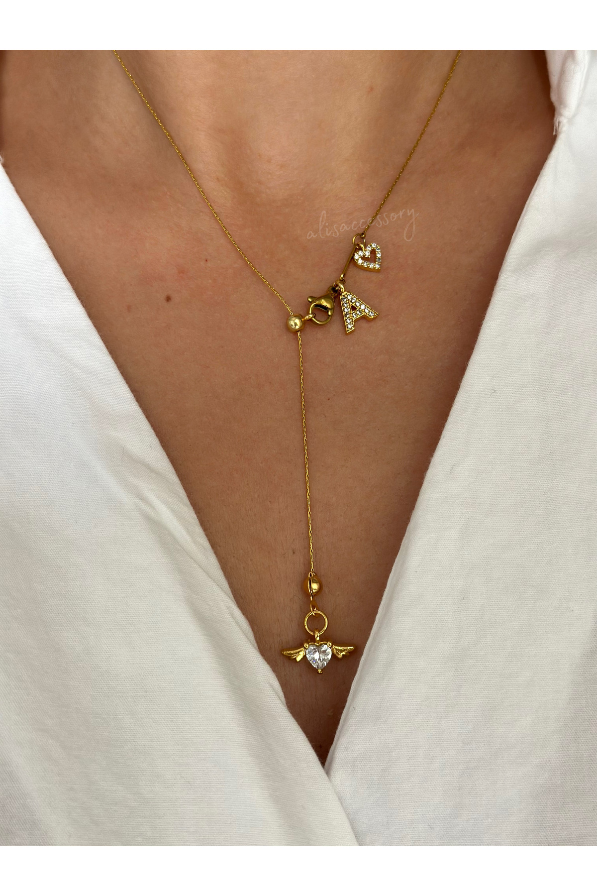 Alis Accessory Kanatlı kalp asansör kolye harfli
