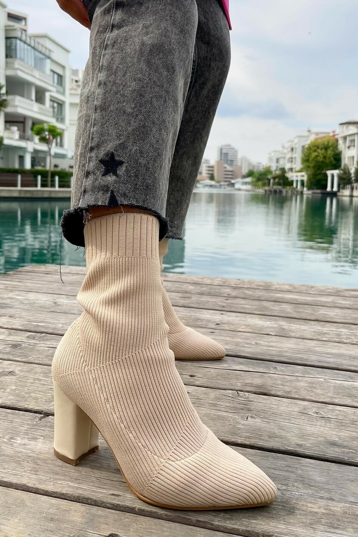 Allyup Günlük Kadın Streç Triko Kalın Yüksek Topuklu Bej Bot Bootie Çorap Şeritli Sivri Burun Ayakkabı 167