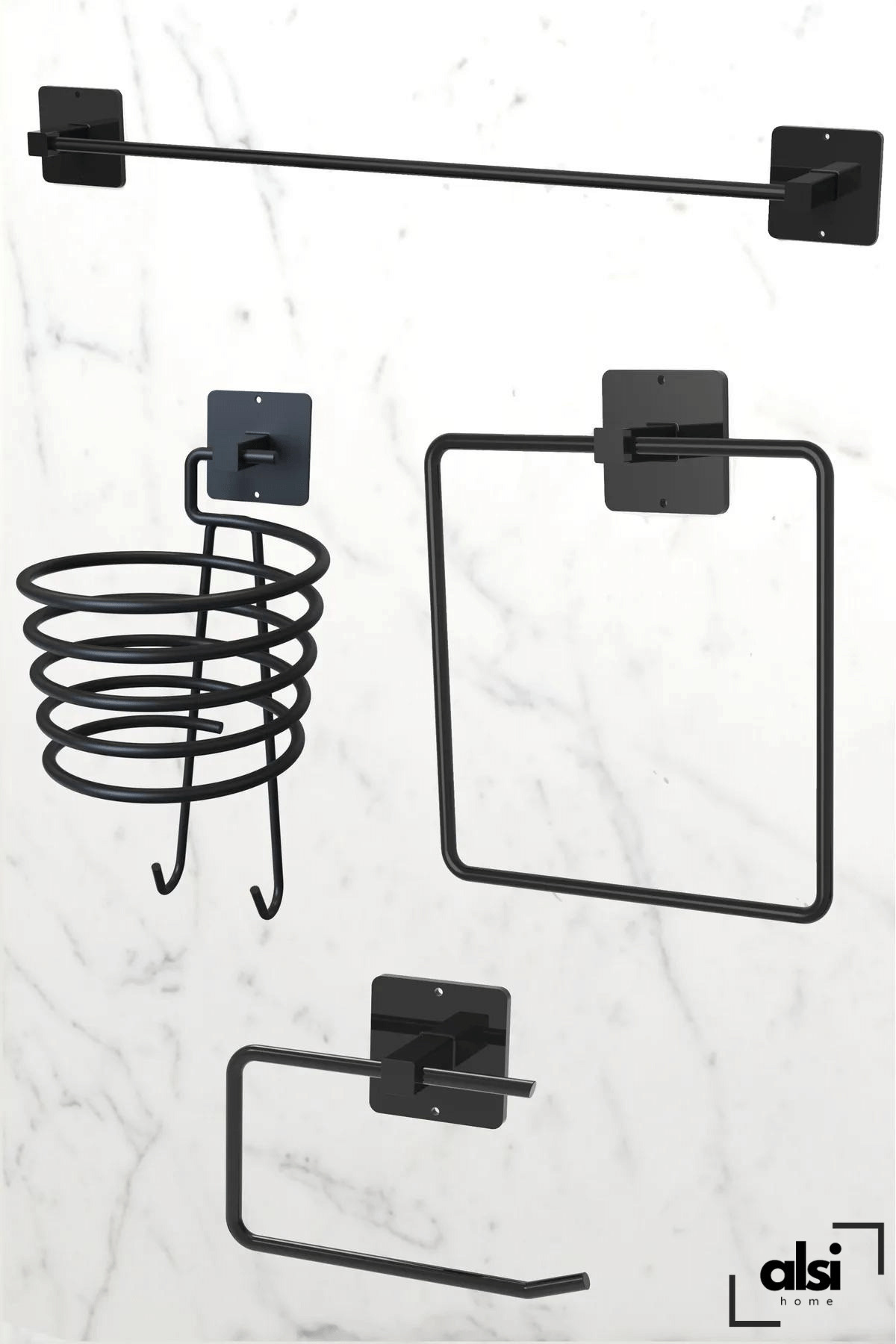 ALSİ HOME Yapışkanlı 4 lü Siyah Fön Makinesi Askısı Havlu Askısı Wc Tuvalet Kağıtlık Kare Havluluk Banyo Set Özellikleri