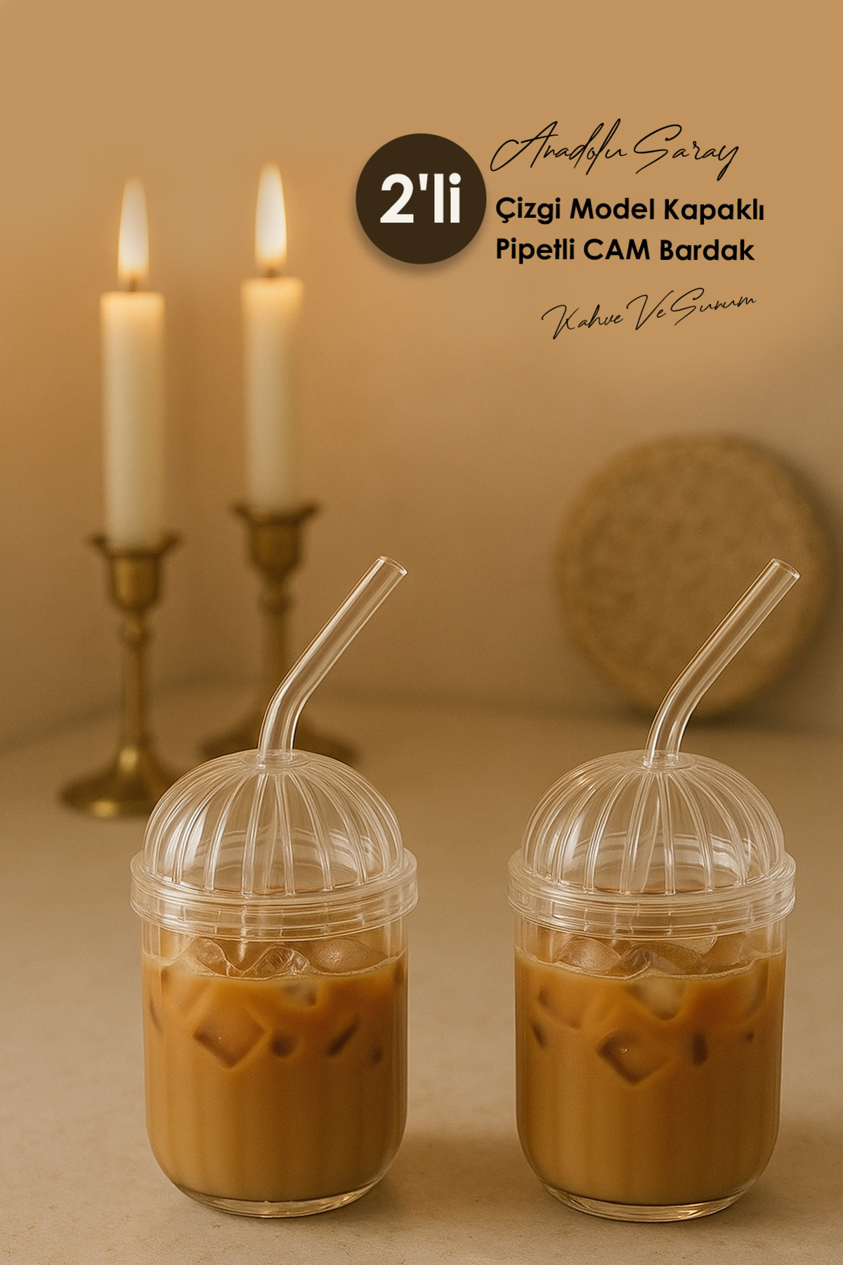 Anadolu Saray 2 Adet Isıya Dayanıklı Borosilikat Çizgi Model Kapaklı Pipetli Bardak EggGlass |Kahve Sunum Bardağı