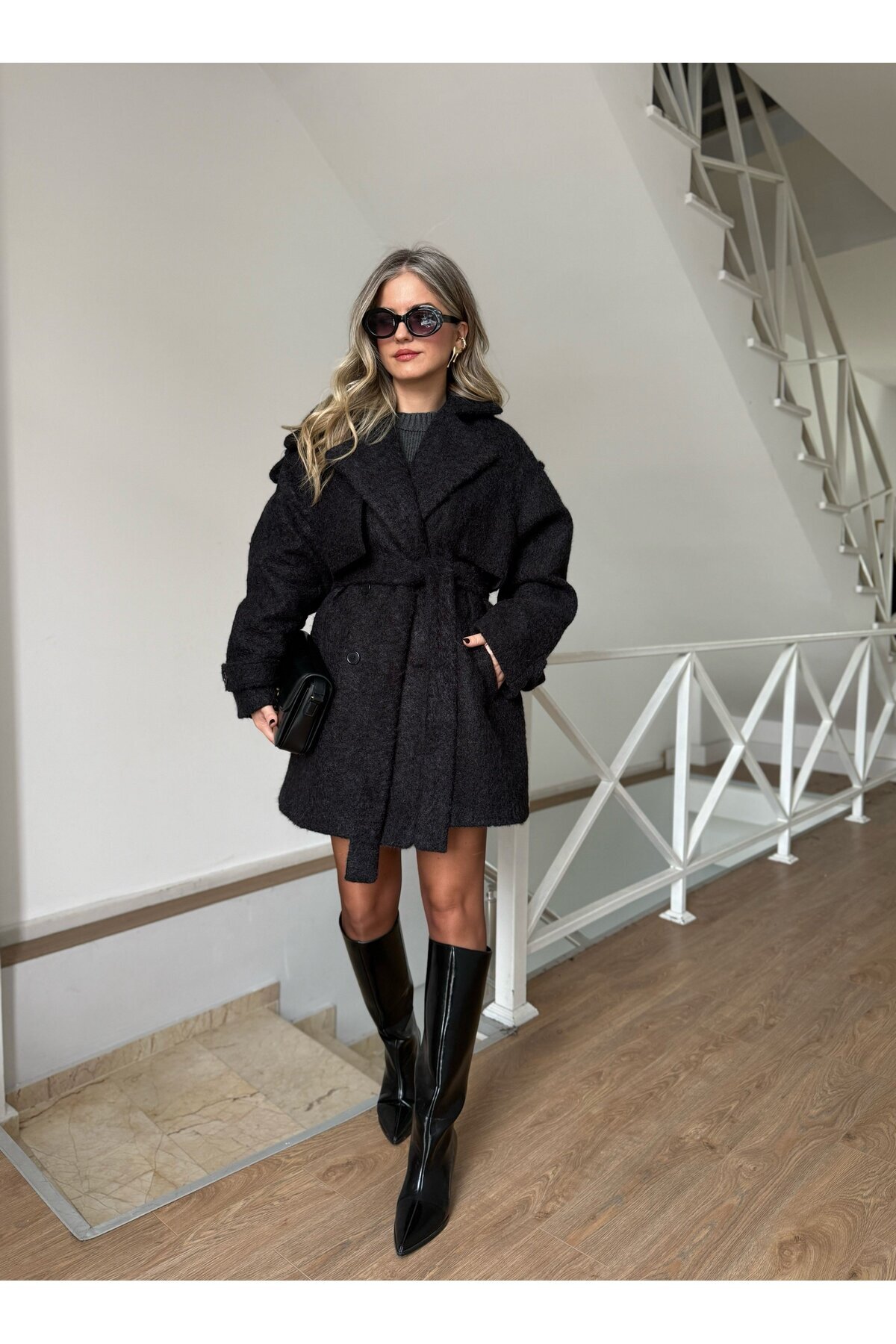 ميزات بأزرار على الجهتين معطف بوكليه بحزام على شكل طوق - أسود من 2she