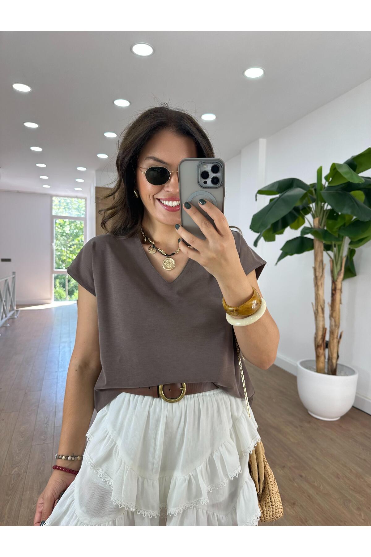 ميزات تيشيرت مودال أساسي برقبة على شكل حرف V - بني من 2she