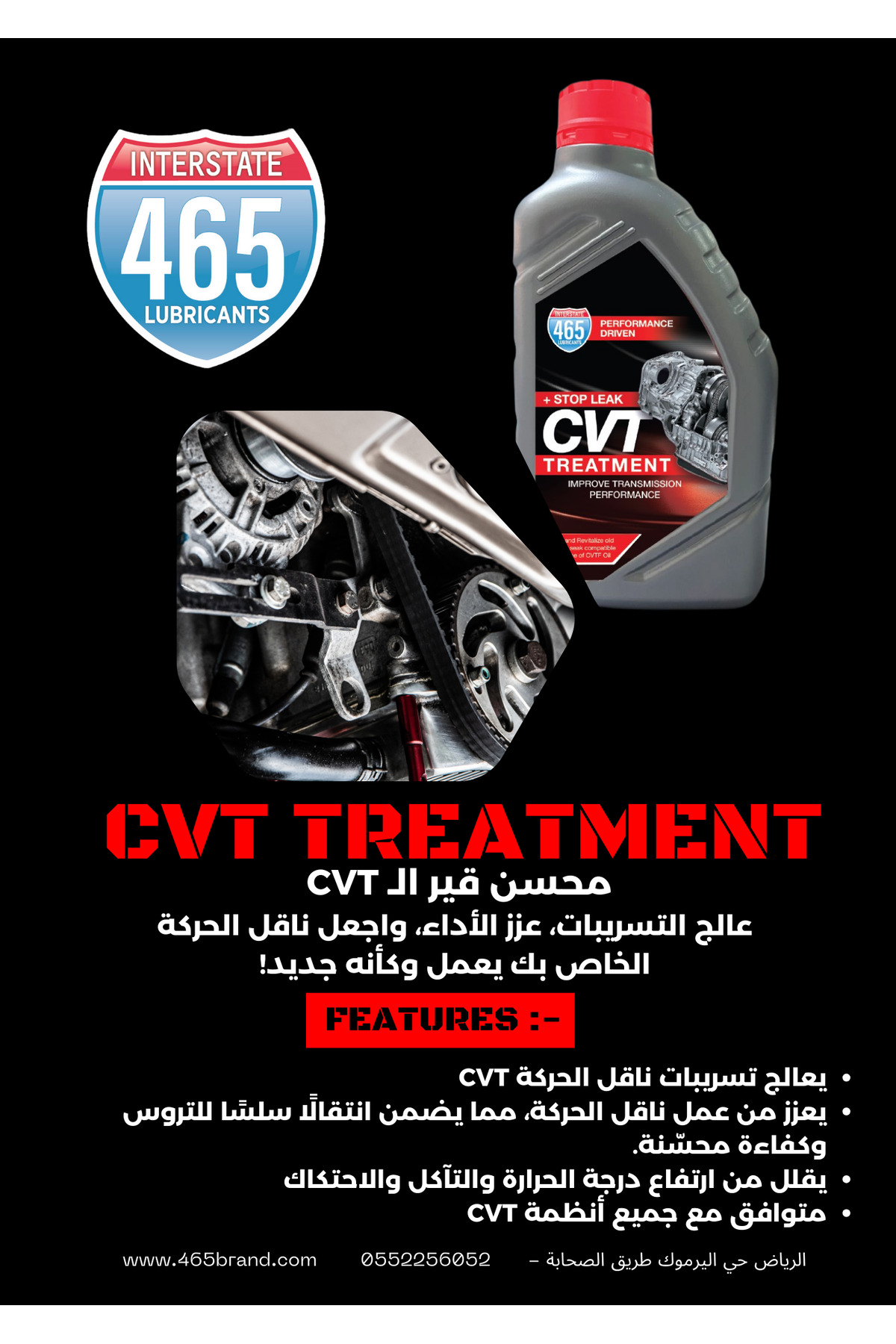 465 معالج و محسن اداء ناقل الحركه الــ Cvt هو الحل الأمثل لكل من يرغب في الحفاظ على ناقل حركة سيارته في أفضل حالاته، مع الجمع بين الأداء الفائق والاقتصادية في الاستهلاك.