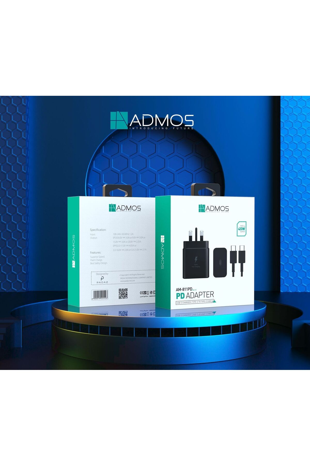 ADMOS محول طاقة 45 واط PD كابل من النوع C إلى النوع C