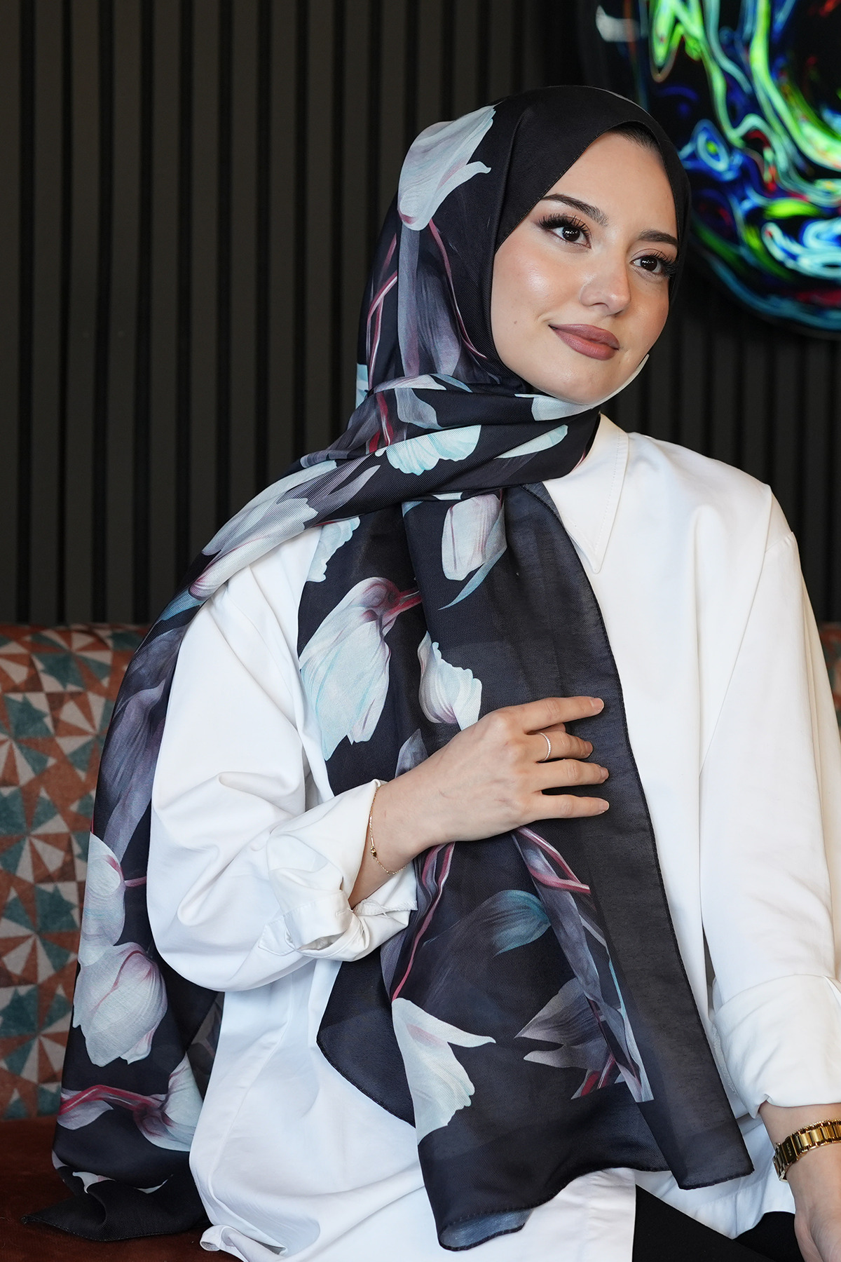 ميزات شال من القطن الناعم باللون الأسود بنمط زهرة التوليب من AFVENTE