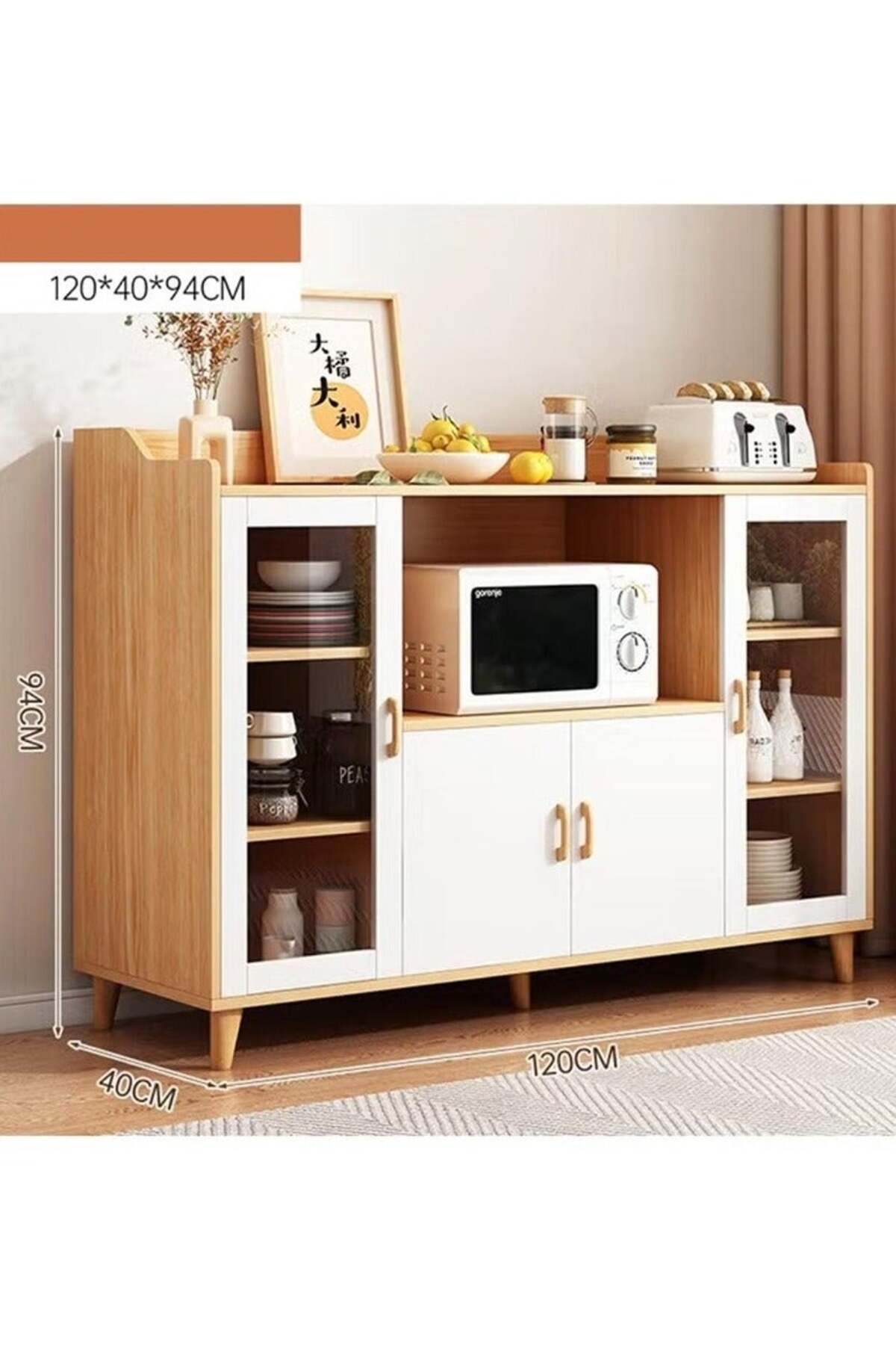 unique vertical wavy tempered glass doors, three-height adjustable shelves, closed cabinet, open shelf, and 2 glass cabinets