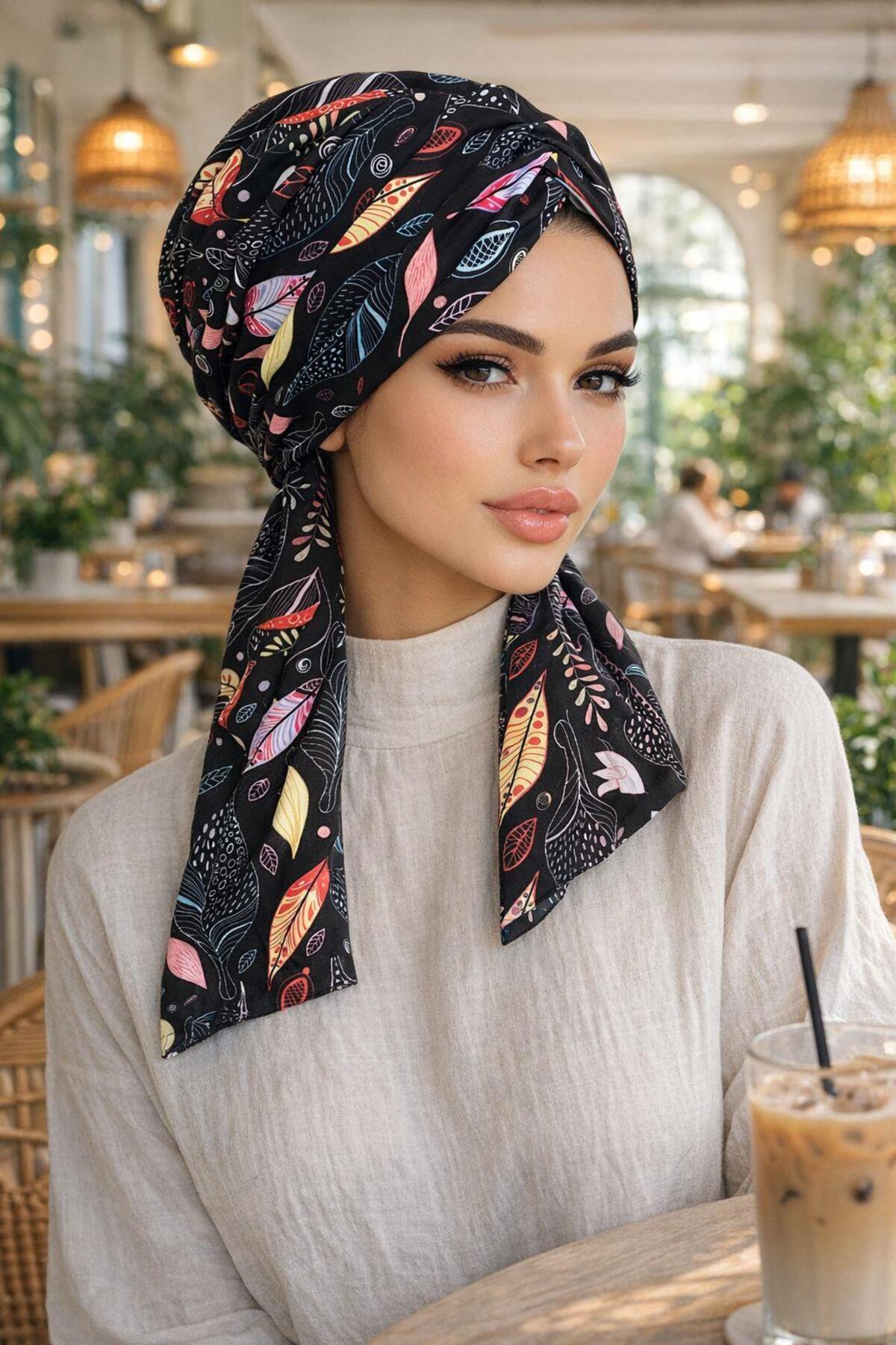 ميزات وشاح أسود منقوش برباط قابل للشد من Aişe tesettür