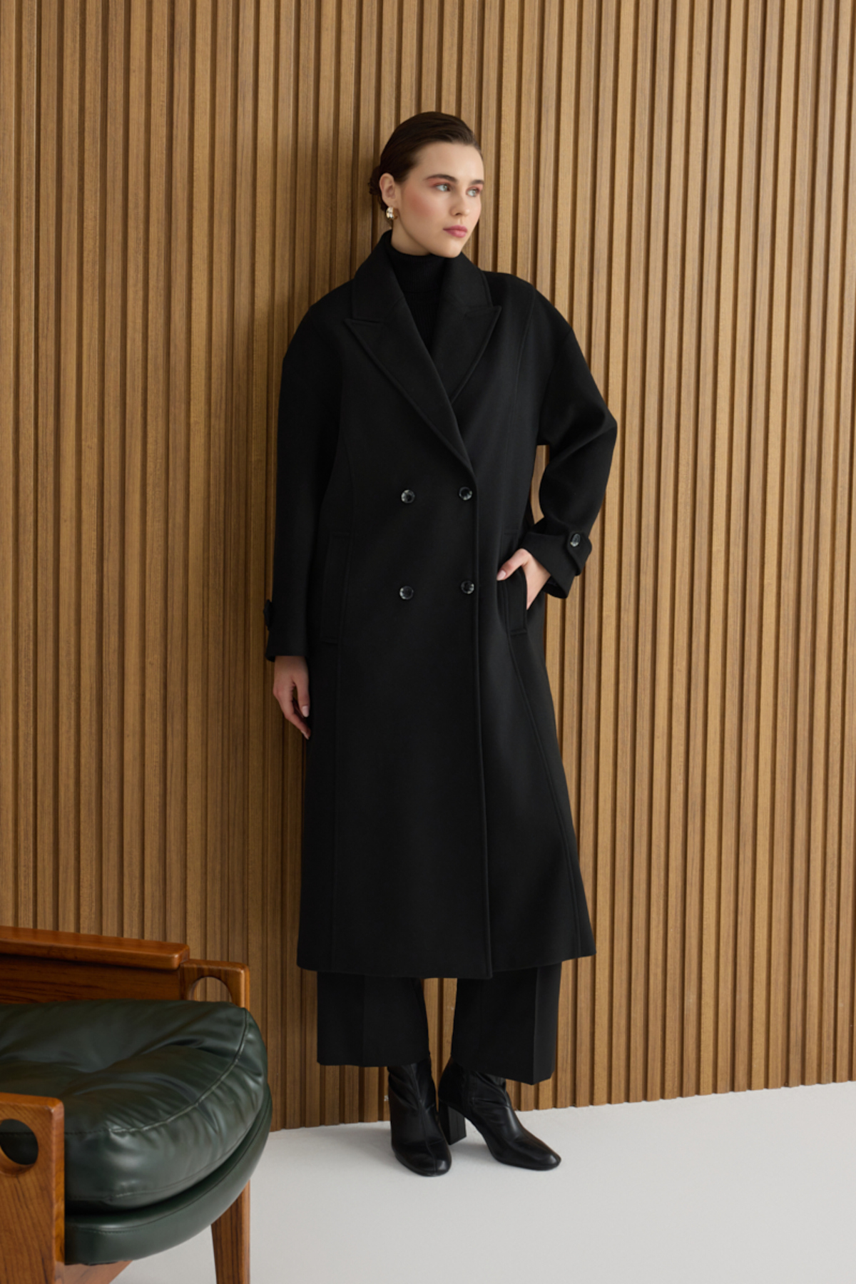 ميزات معطف أسود بأزرار على الجهتين كابا من Aker