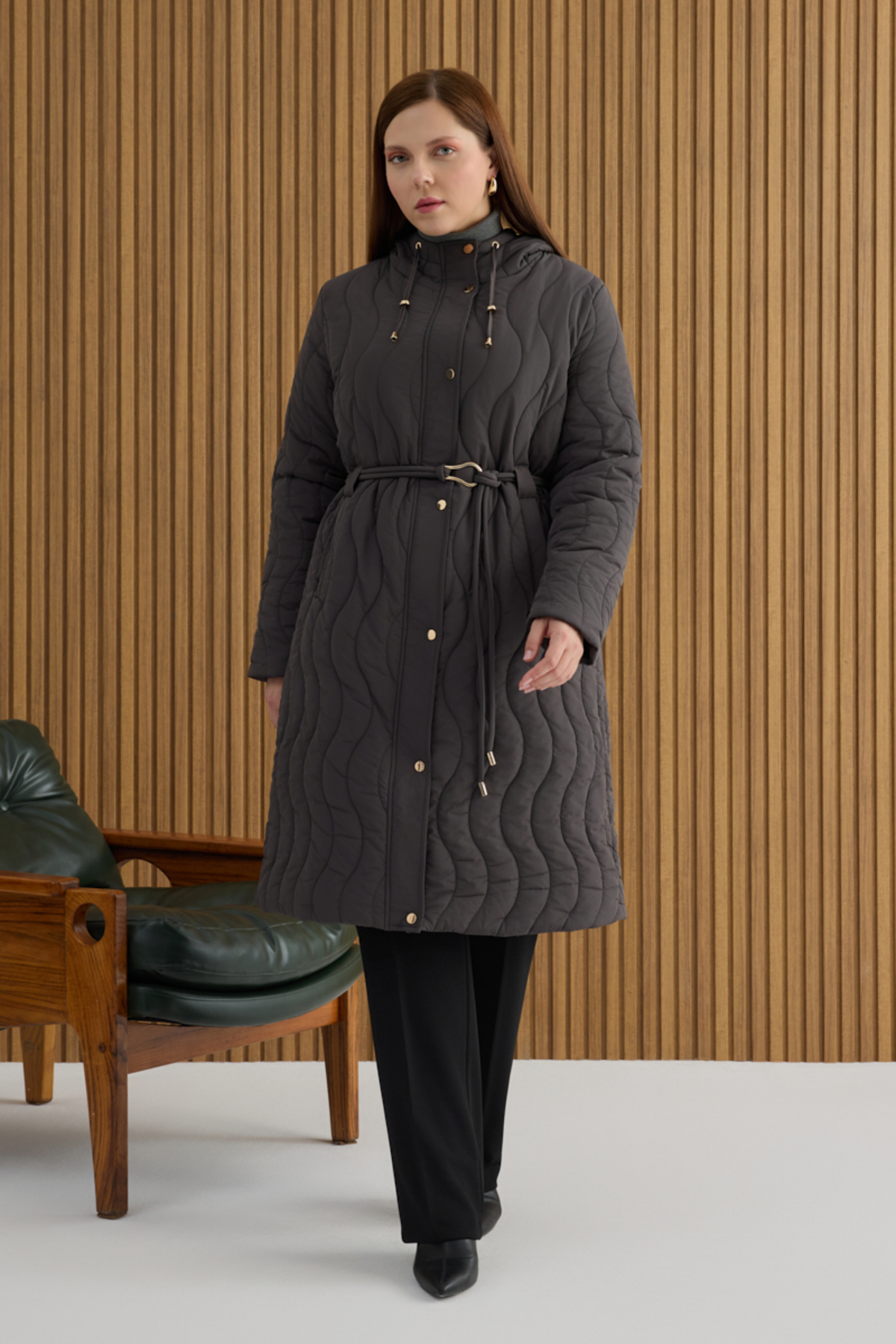 ميزات معطف رمادي اللون مع خصر مطاطي قابل للتعديل من Aker