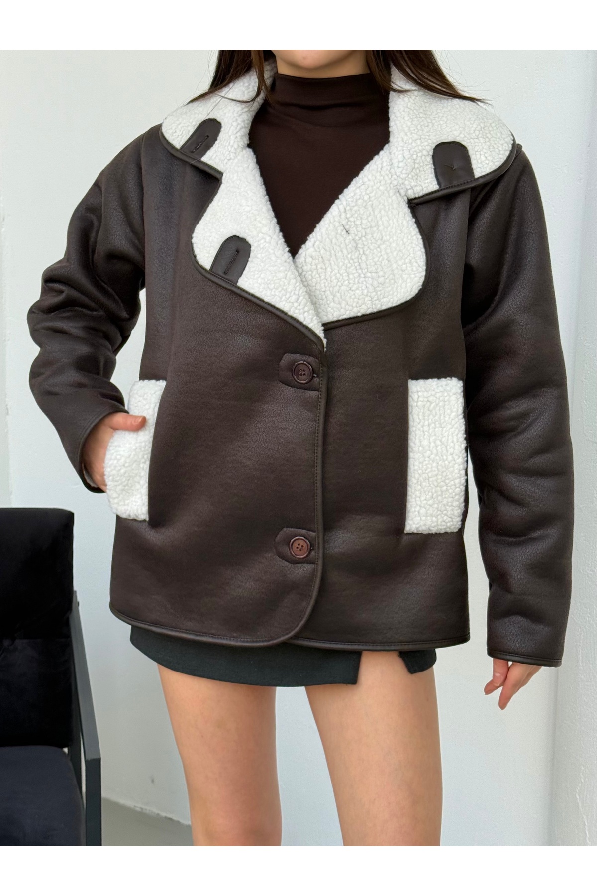ميزات سترة من جلد الغزال مع جيوب مبطنة بالقطيفة وأزرار من ASEDE