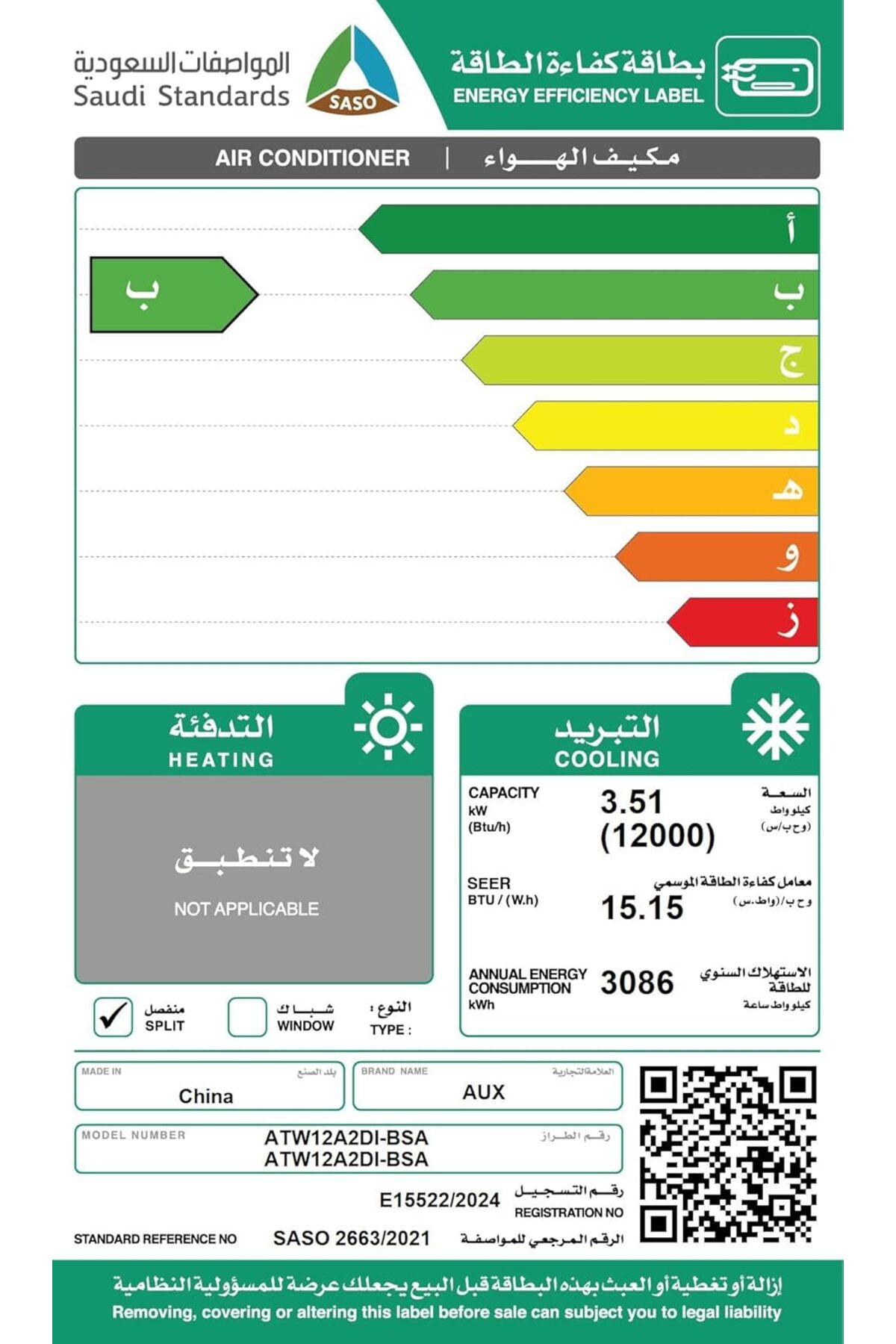 Aux مكيف هواء سبليت بتقنية العاكس DC