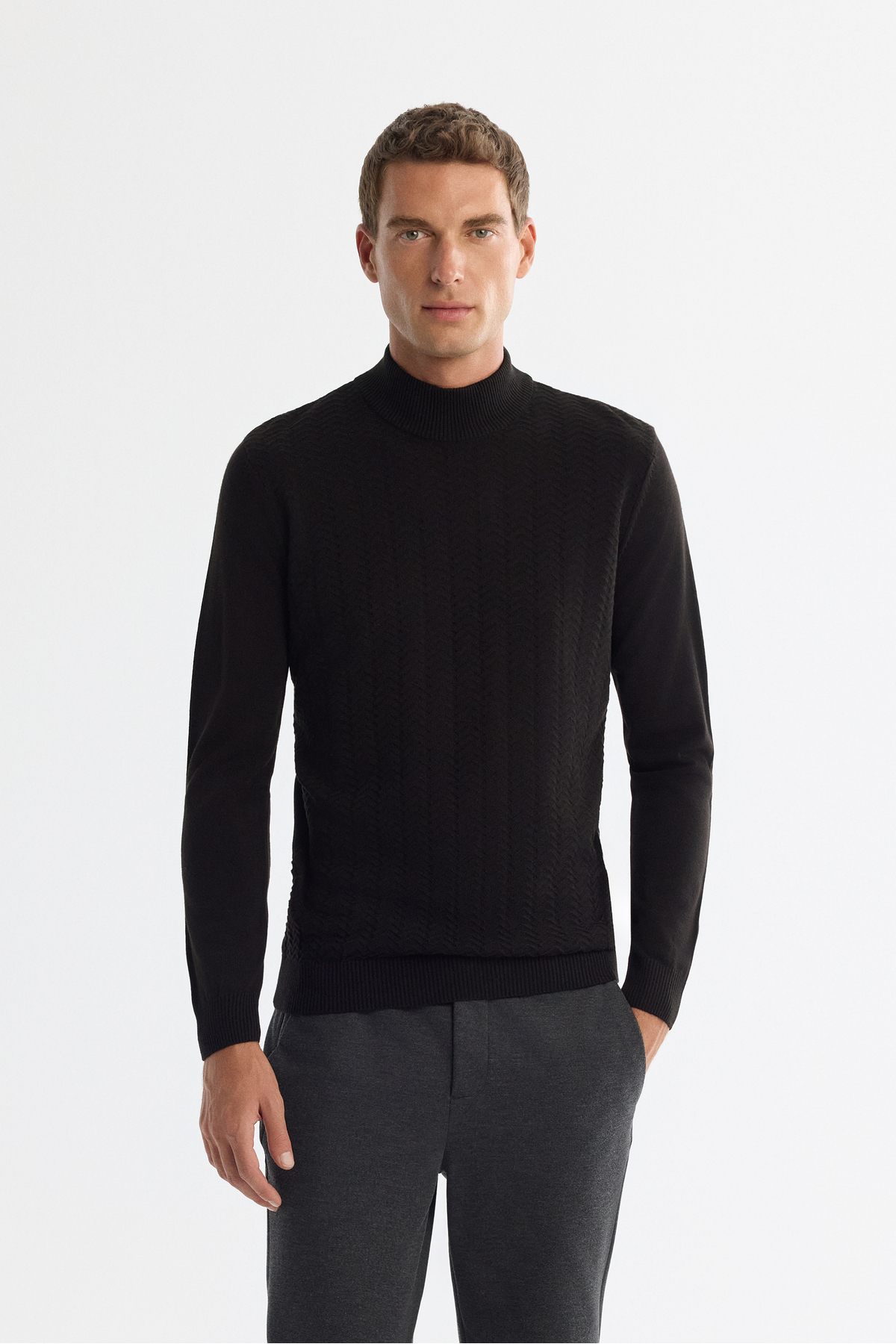 Avva سترة رجالية سوداء بنصف ياقة صياد ونسيج أساسي E005108