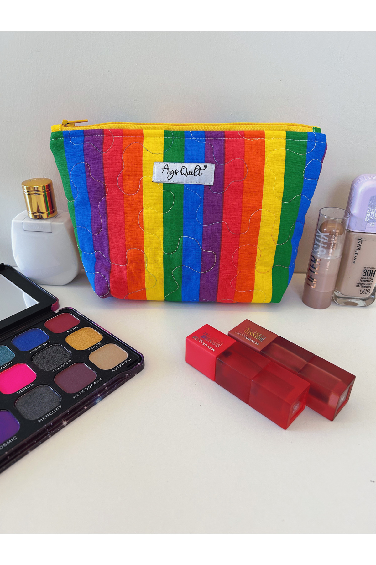 ميزات حقيبة مكياج بنقشة قوس قزح من Ays Quilt