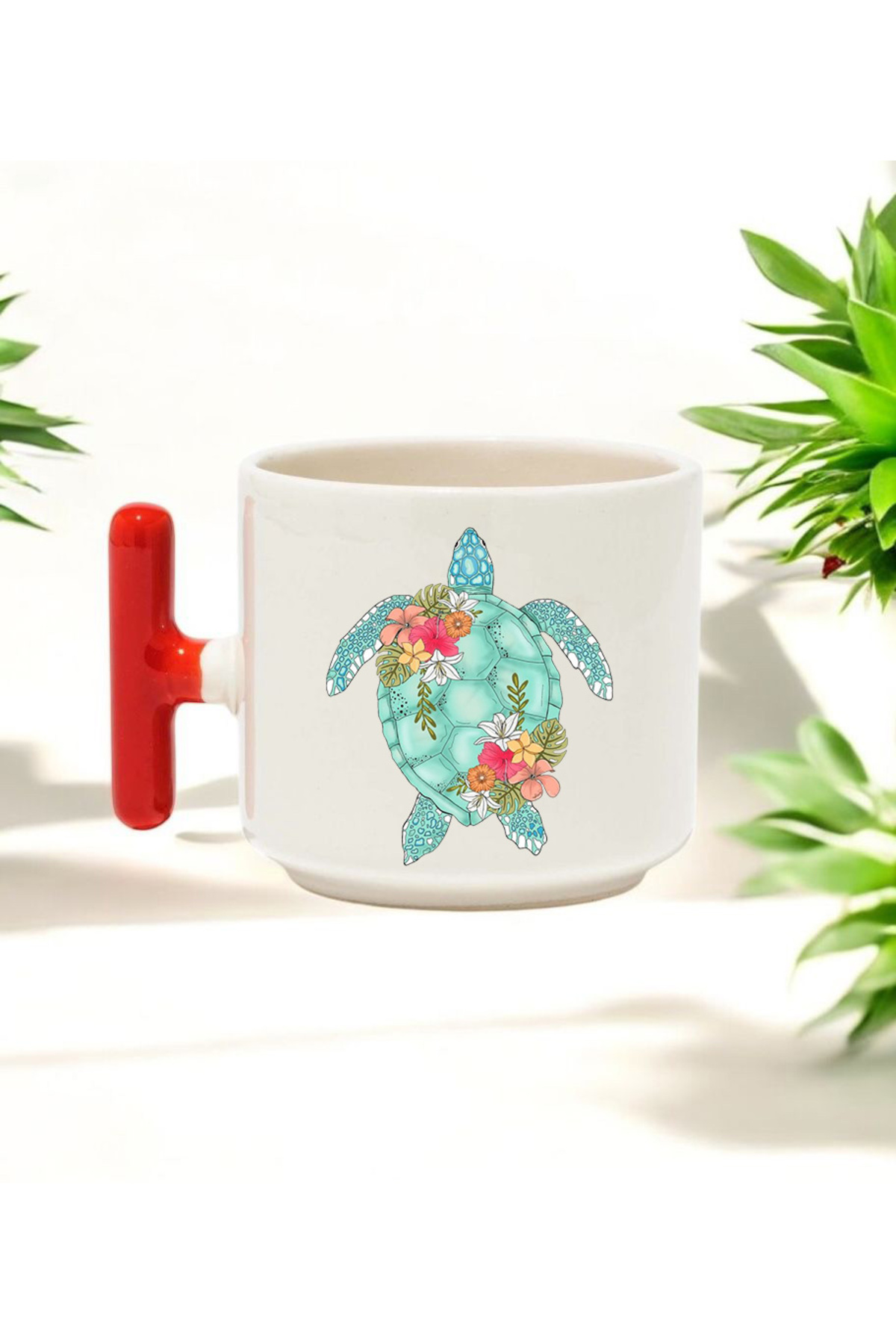 BB TRADE كوب سيراميك مطبوع بتصميم سلحفاة بمقبض على شكل حرف T باللون الأحمر سعة 250 مل