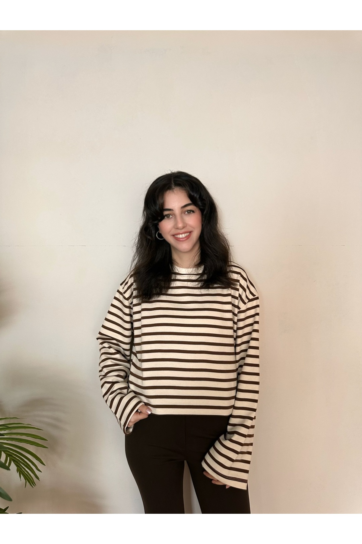 ميزات سويت شيرت أساسي مخطط باللون البني البيج من BELISTIL