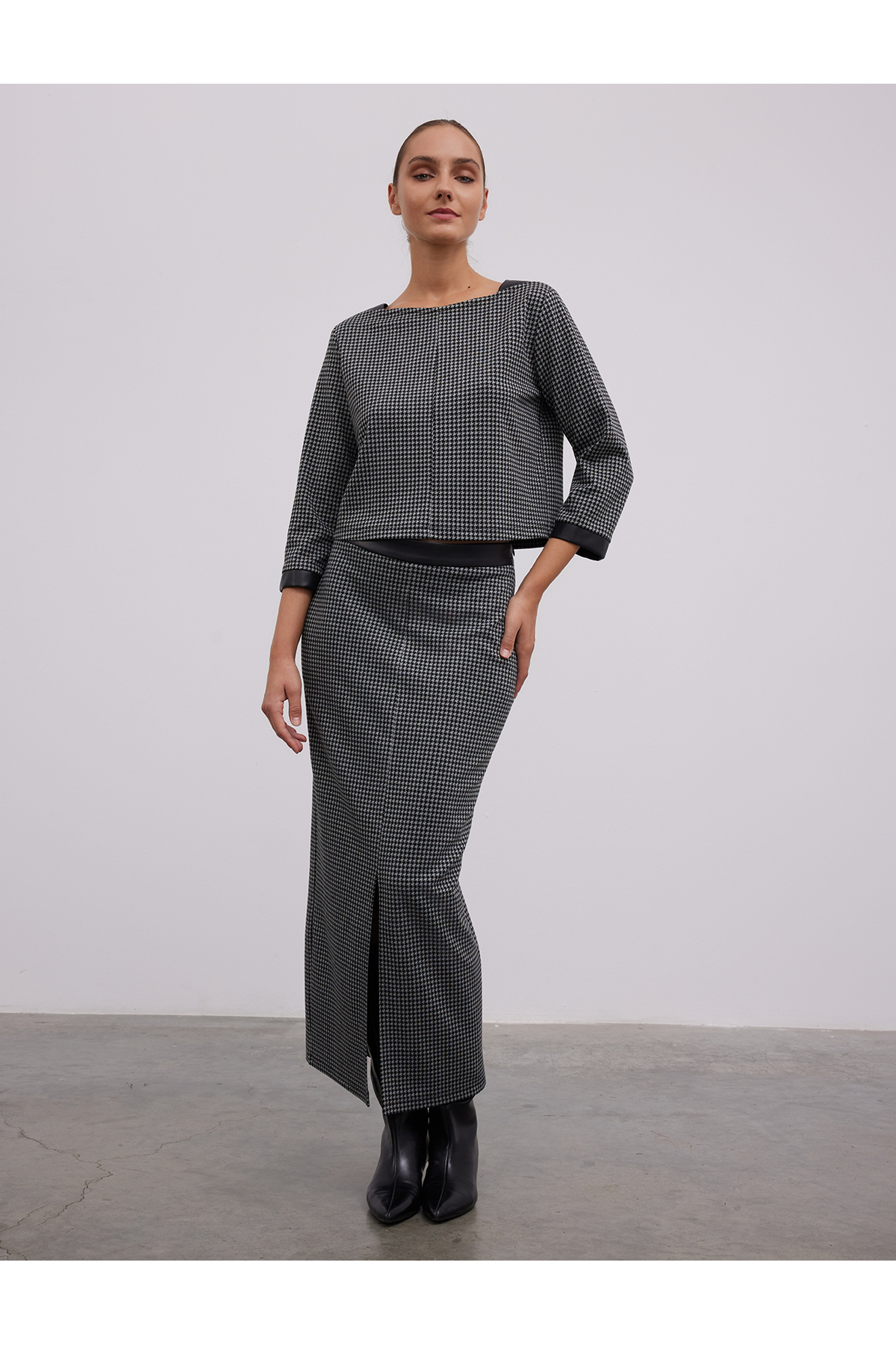 ميزات تنورة ميدي من الجلد المنقوشة من كازاياجي بقطع قماش مخيطة معاً من BGN workshop