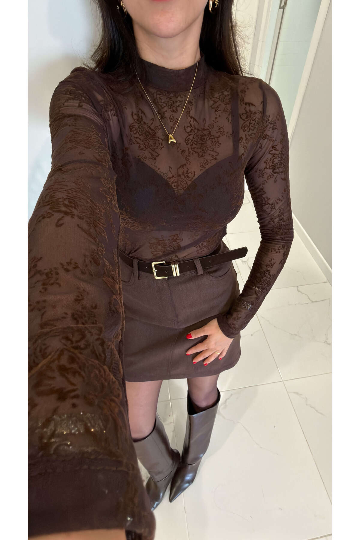 ميزات بلوزة بوندري من التول المزخرف باللون البني من BİRCANÇİL