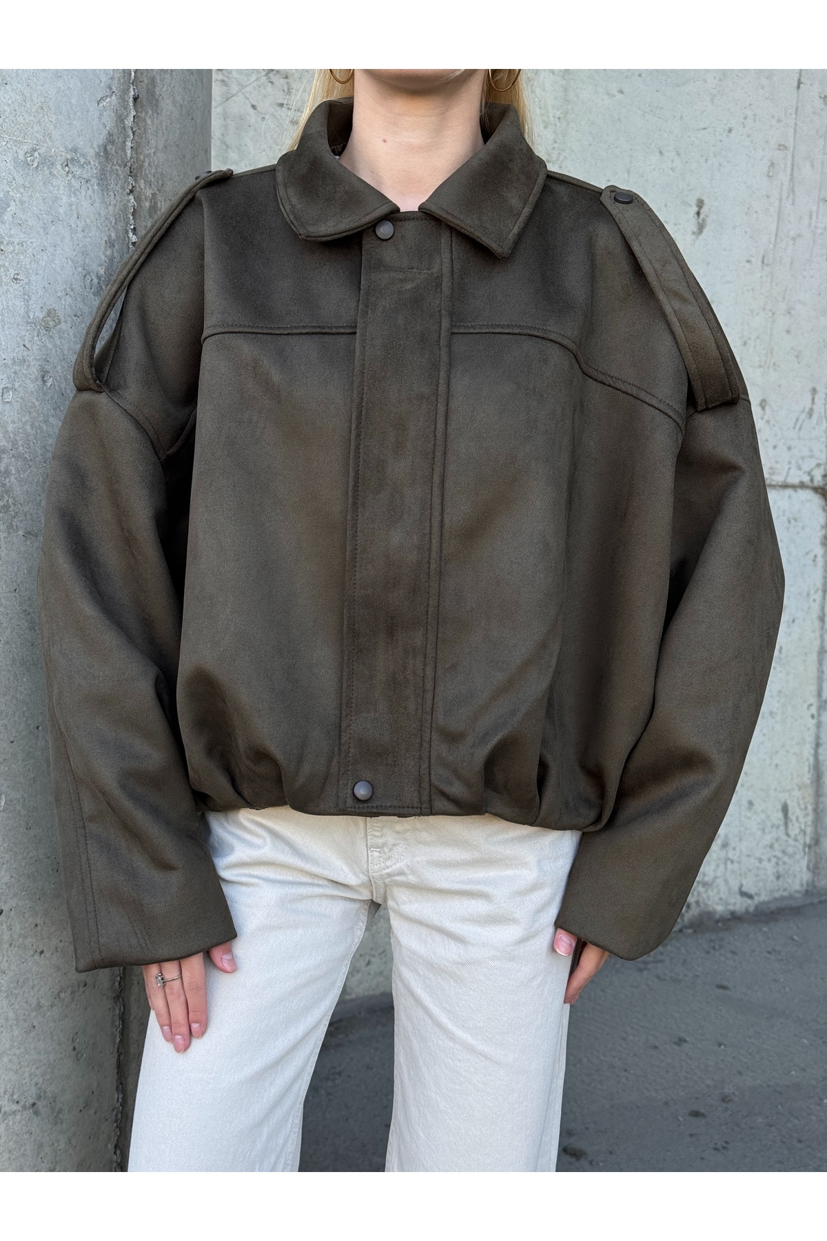 ميزات سترة قصة فضفاضة تريند بومبر من جلد الغزال من bobitex