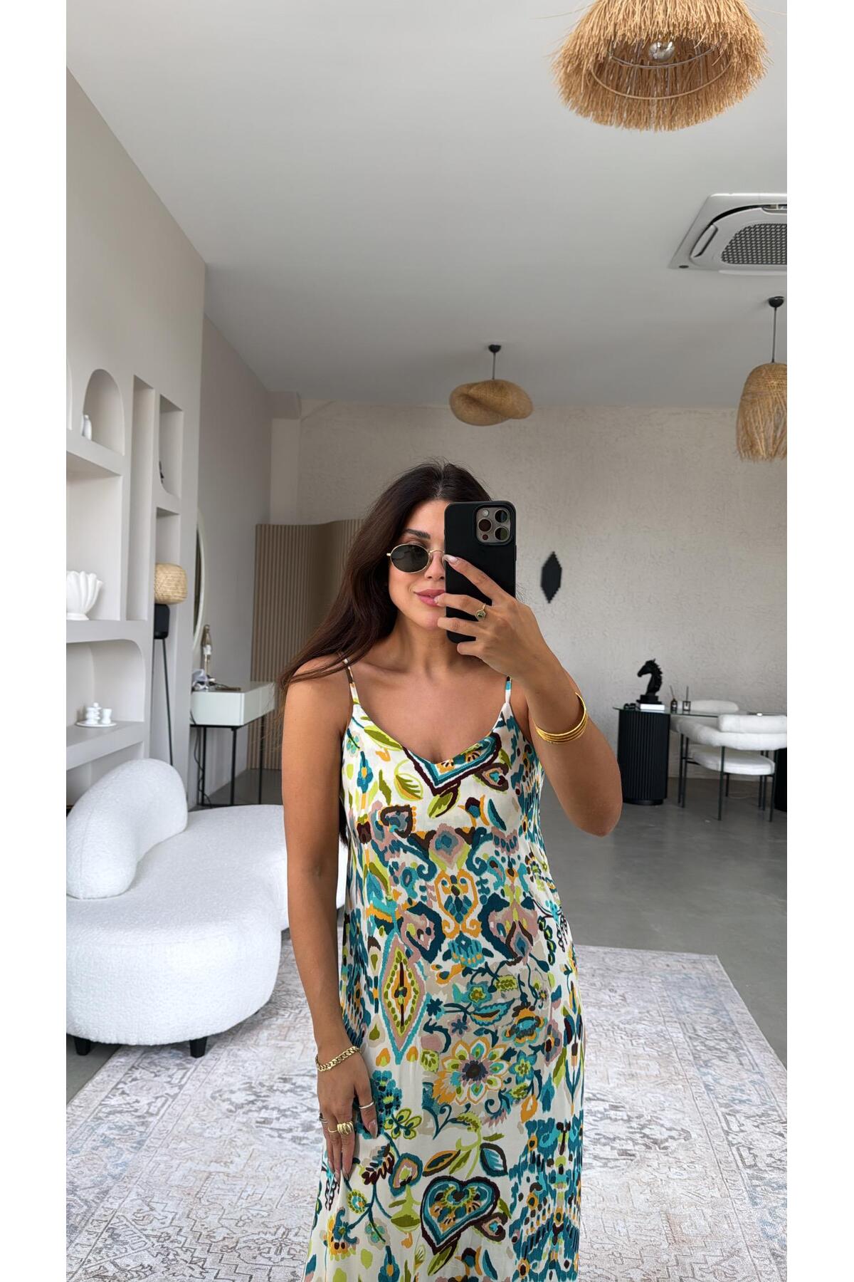 ميزات فستان فيسكوز بحمالات منقوشة بالنيون من Buket Teke