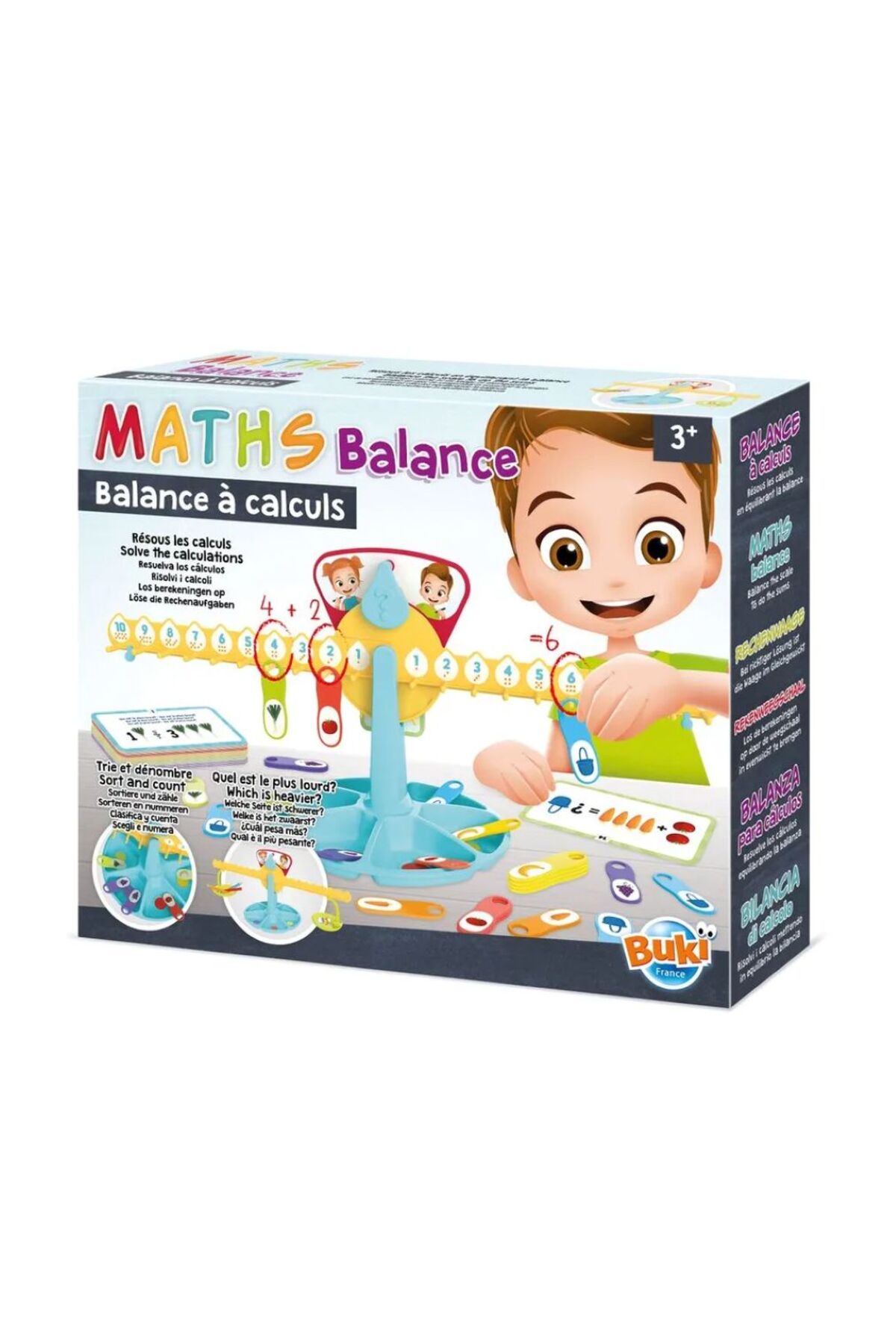 Includes: 1 maths balance, 2 trays, 30 tokens in 6 different colours, 30 double-sided puzzle cards, 1 sheet of stickers, activity guide.