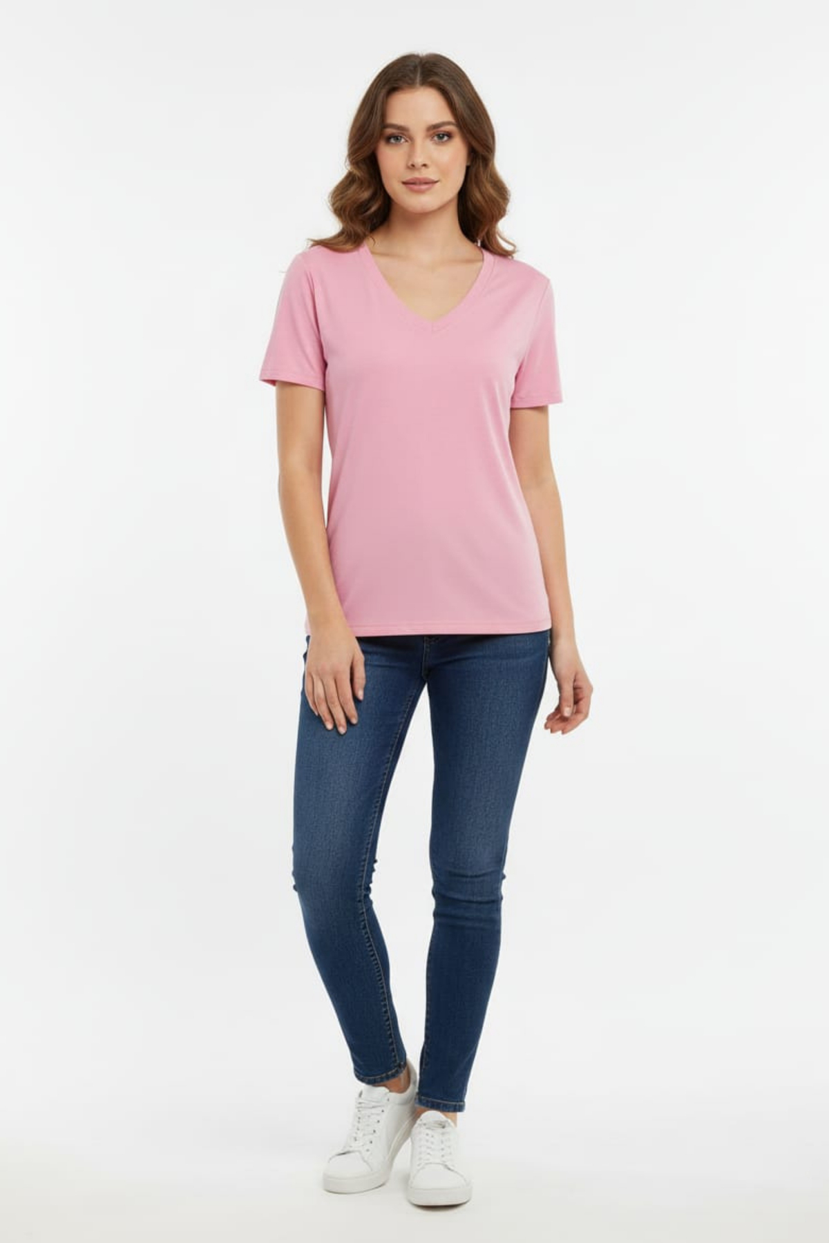 ميزات تي شيرت أساسي من قماش المودال برقبة على شكل حرف V باللون الوردي من BUSEM