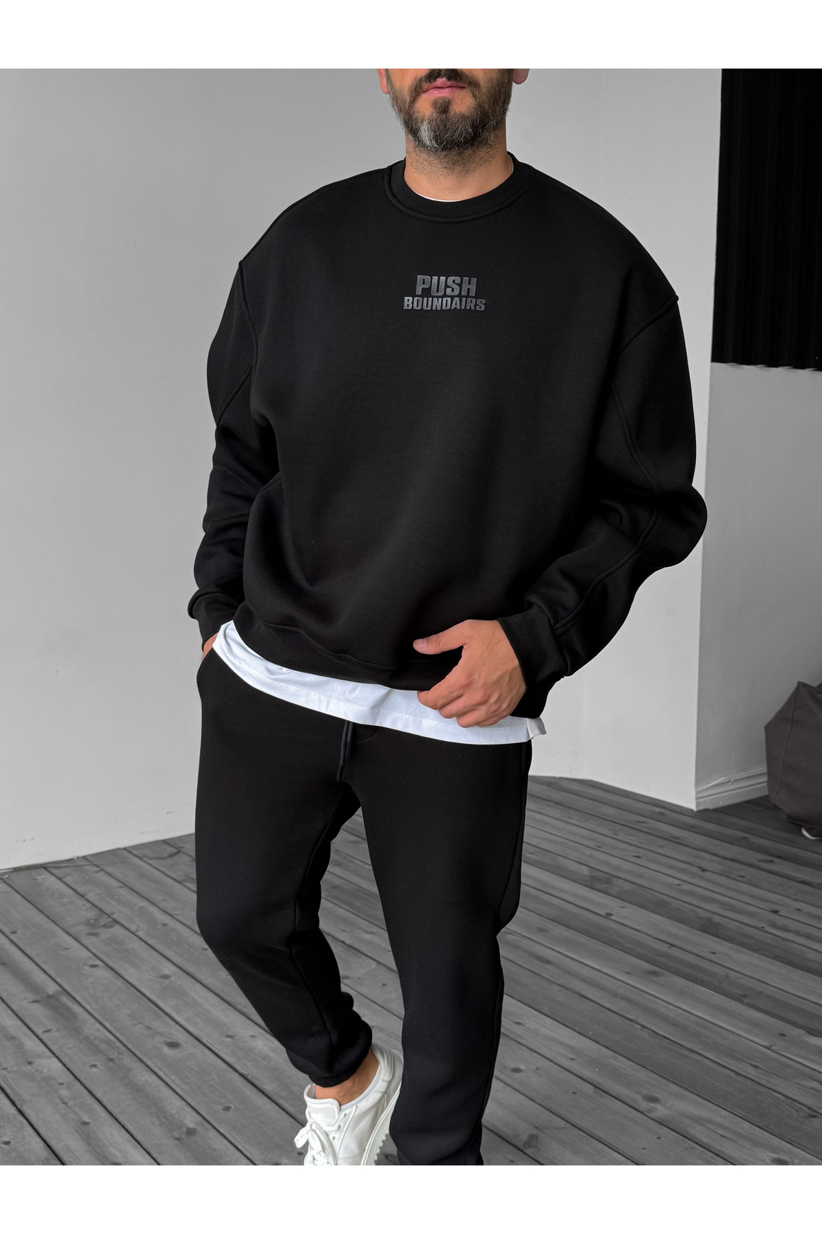 ميزات سويت شيرت أسود منقوش بالضغط YP-4095 من BYBASICMAN