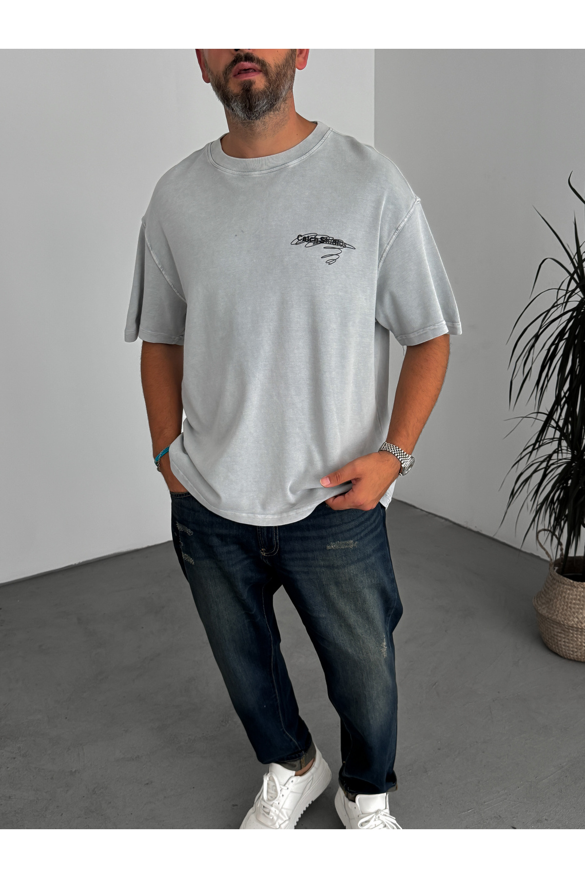 BYBASICMAN تي شيرت رمادي مطبوع قابل للغسل CS C-033