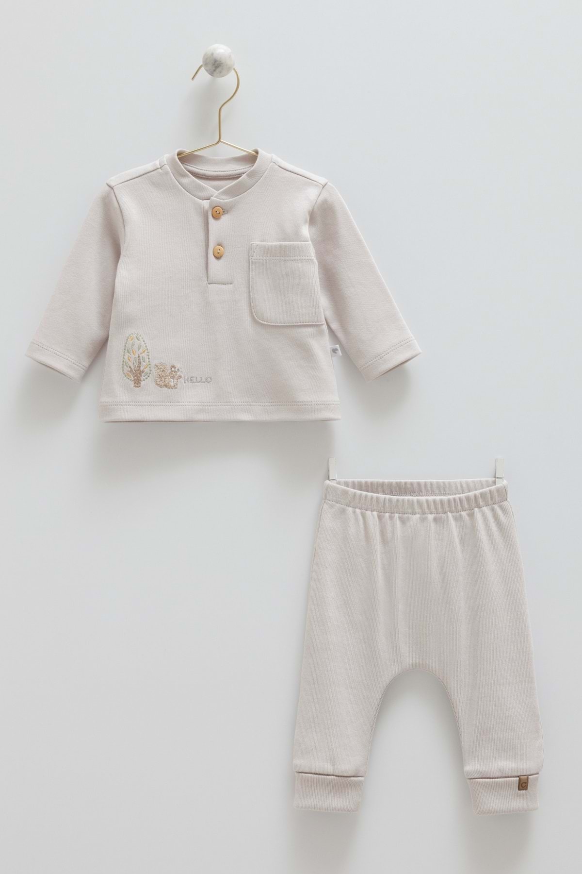 ميزات طقم HELLO FOREST مكون من قطعة علوية وسفلية بأزرار على شكل ياقة باللون الرمادي من Caramell