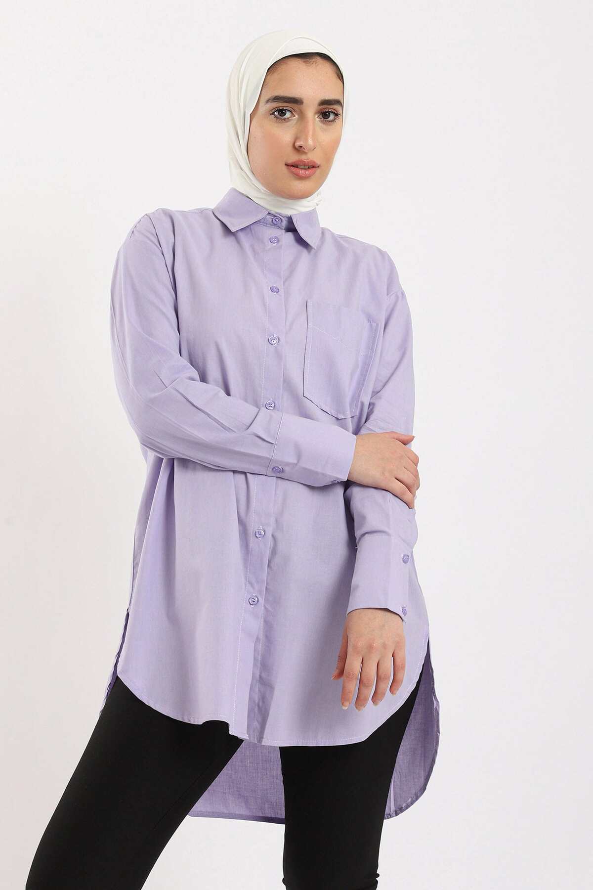 ميزات قميص سادة بأكمام طويلة وأزرار أمامية من CARINA