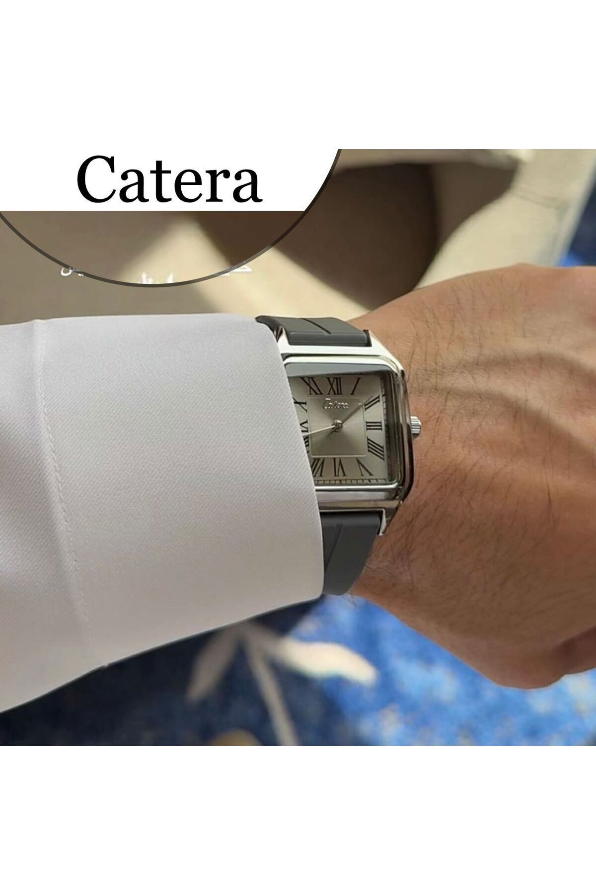 ميزات ساعة رجالي ربل اطار فضي سير رمادي من catera