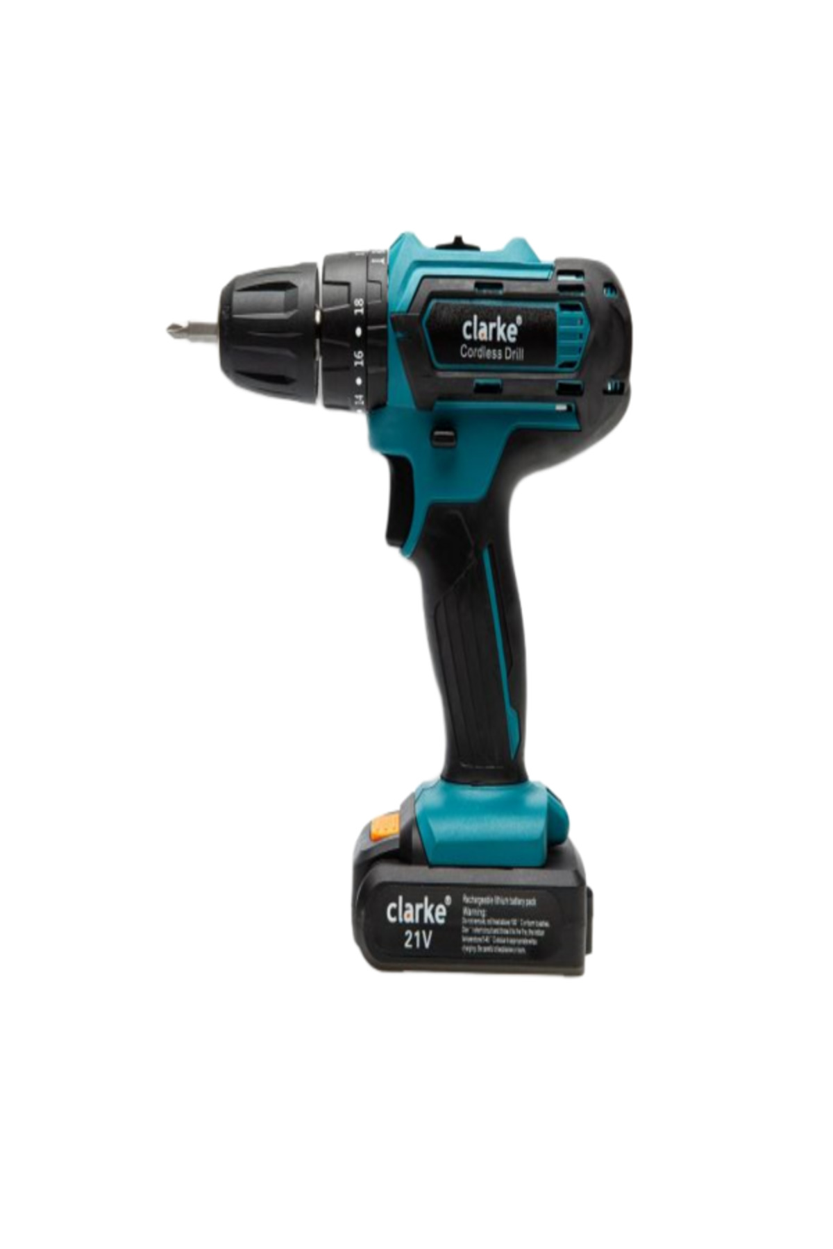 ميزات مثقاب لاسلكي 21 فولت مع مجموعة رؤوس مثقاب من Clarke