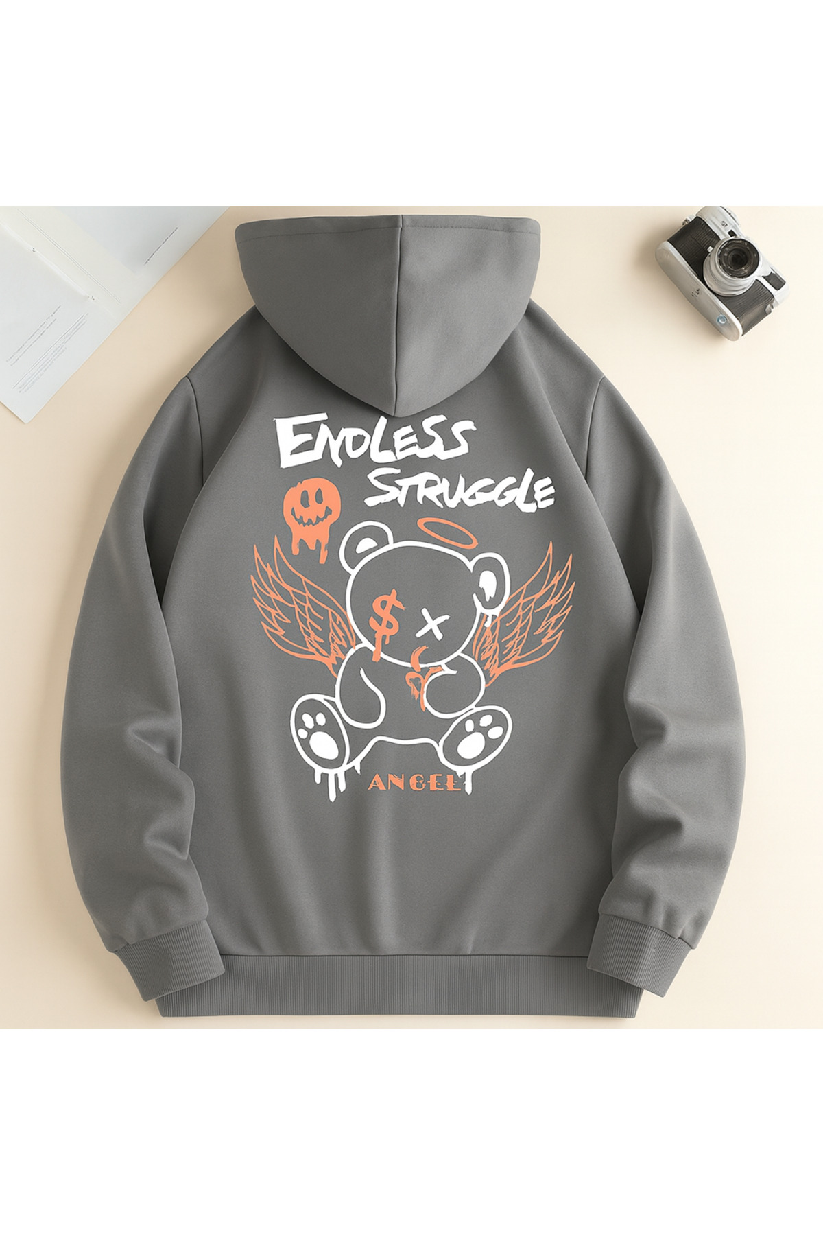 CLASSY.MODA سويت شيرت كبير الحجم بطبعة دب 3 خيوط مع غطاء للرأس