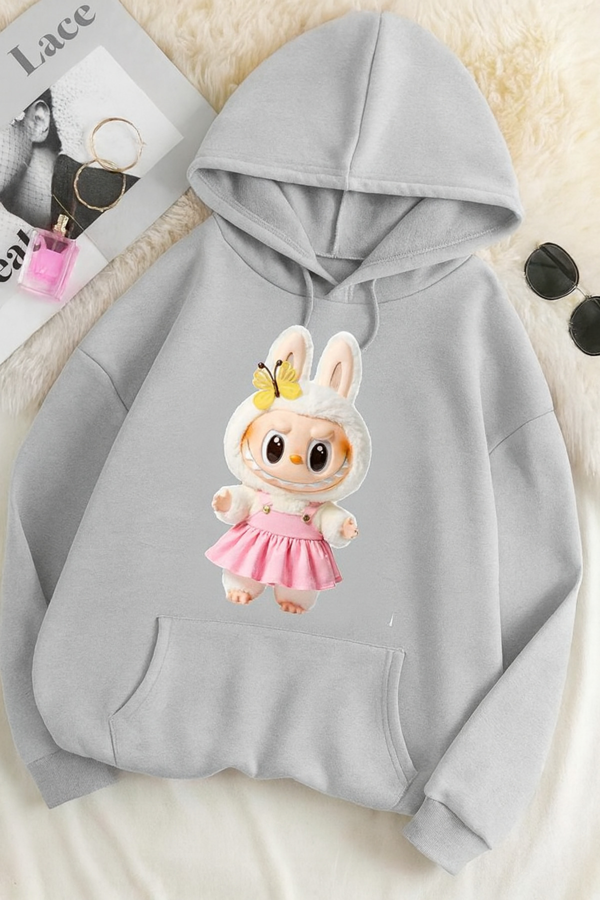 ميزات سويت شيرت مطبوع عليه 3 خيوط للجنسين مقاس كبير – نمط أرنب لابوبو 🐰 🦋 من CLASSY.MODA