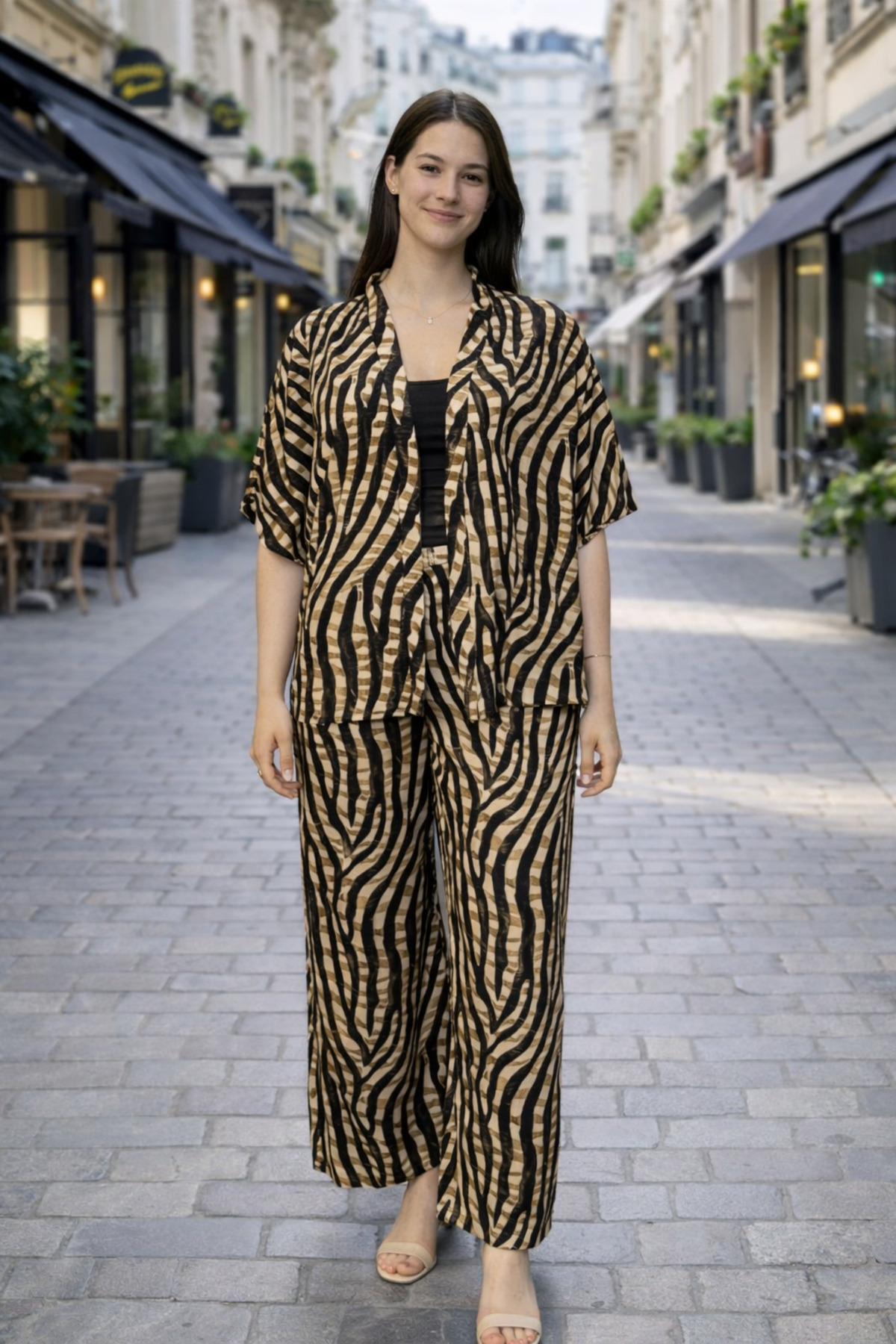 Clyfora مجموعة زيبرا منقوش بقصة قصيرة كيمونو