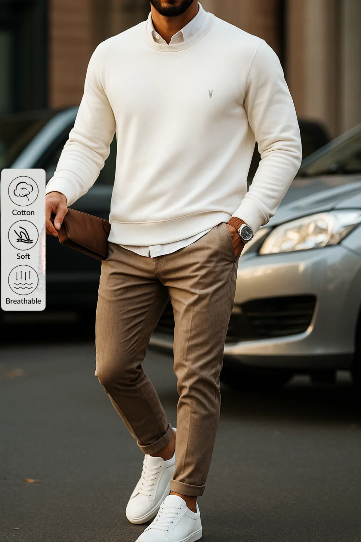 ميزات سويت شيرت أبيض برقبة دائرية للرجال من بيسك من COMBİNE MİCHAİL